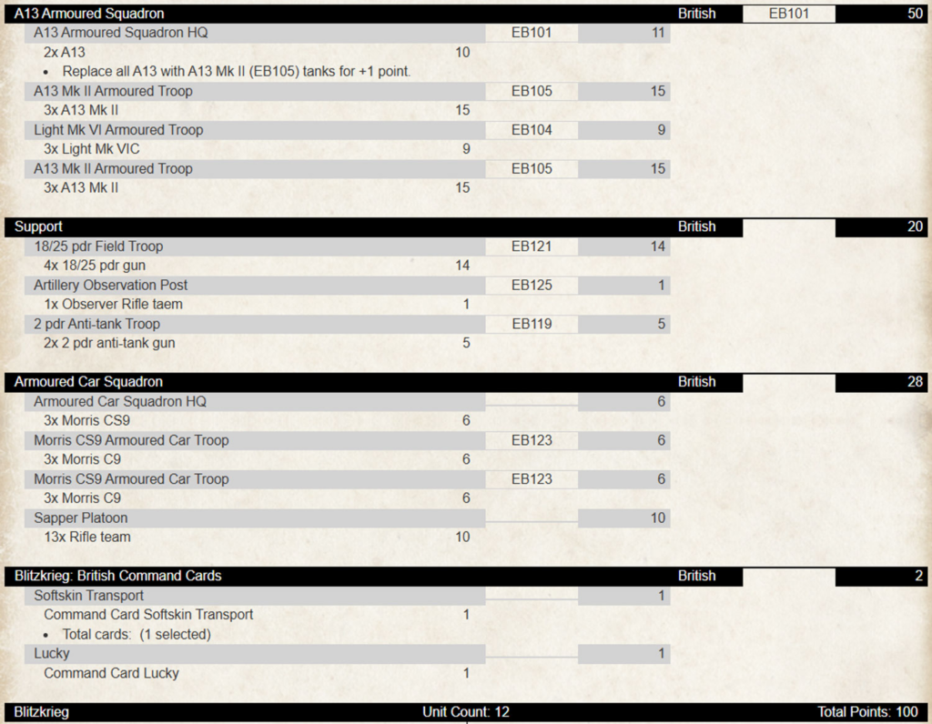 Finally, the A13 Armoured Squadron plus Armoured Car Squadron route builds two small formations. You use a sapper platoon to turn your box infantry into a formation unit, while Morris CS9 armoured cars spearhead and poke light armor with AT4 Boys rifles. Tanks still do the heavy lifting, supported by sappers and dual purpose 18 or 25pdrs. This is the priciest route at $375 because you are buying multiple CS9 troops.