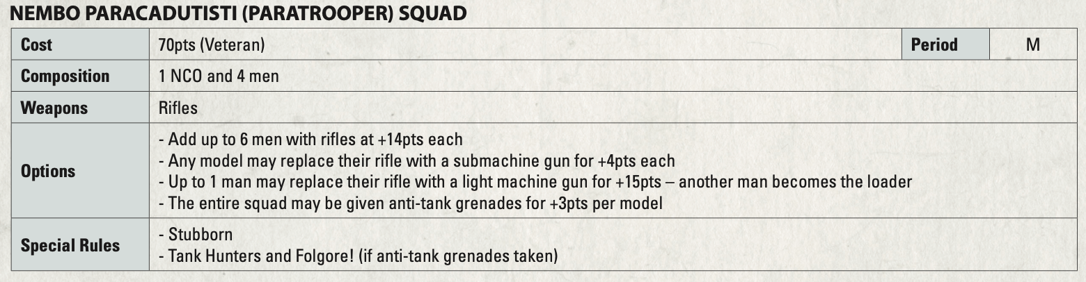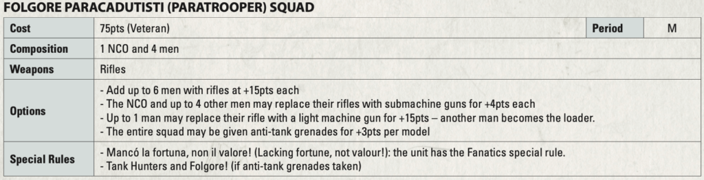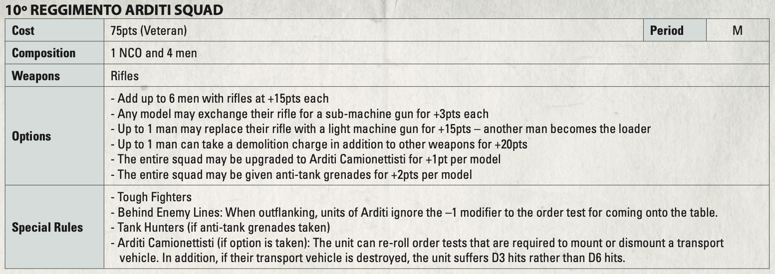 On rules, it breaks out Folgore and Nembo, and both are Stubborn Veterans. Meanwhile, Folgore add Fanatics, while Nembo can max SMGs for close-range firepower. Finally, Arditi are Veteran Tough Fighters, and they love Behind Enemy Lines outflanks or transport rushes.