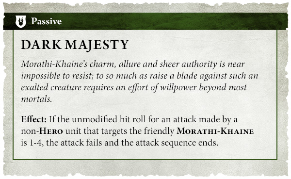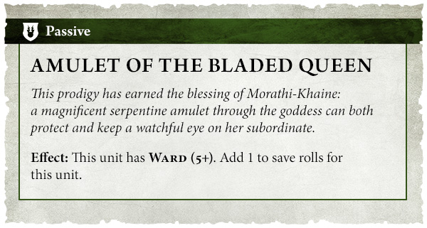 Dark Majesty is the big eye-catcher, because non-Hero units targeting Morathi simply fail on unmodified hit rolls of one to four. Then Cursed Heritage adds a nasty damage spike by splashing D3 mortal damage onto enemy units fighting non-Unique Zainthar Kai units. Likewise, Morathi can hand out the Amulet of the Bladed Queen, which gives Ward (5+) and plus one to saves, so the whole package reads like an elite, favored-inner-circle build.