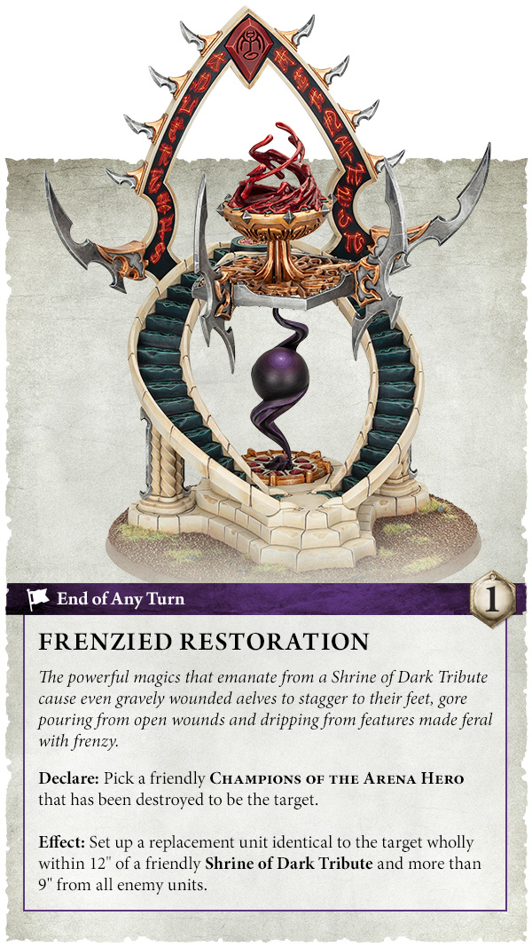 Frenzied Restoration also lets a destroyed Hero return near a Shrine of Dark Tribute, while Hero of the Killing Games turns a champion into a dedicated Hero blender.