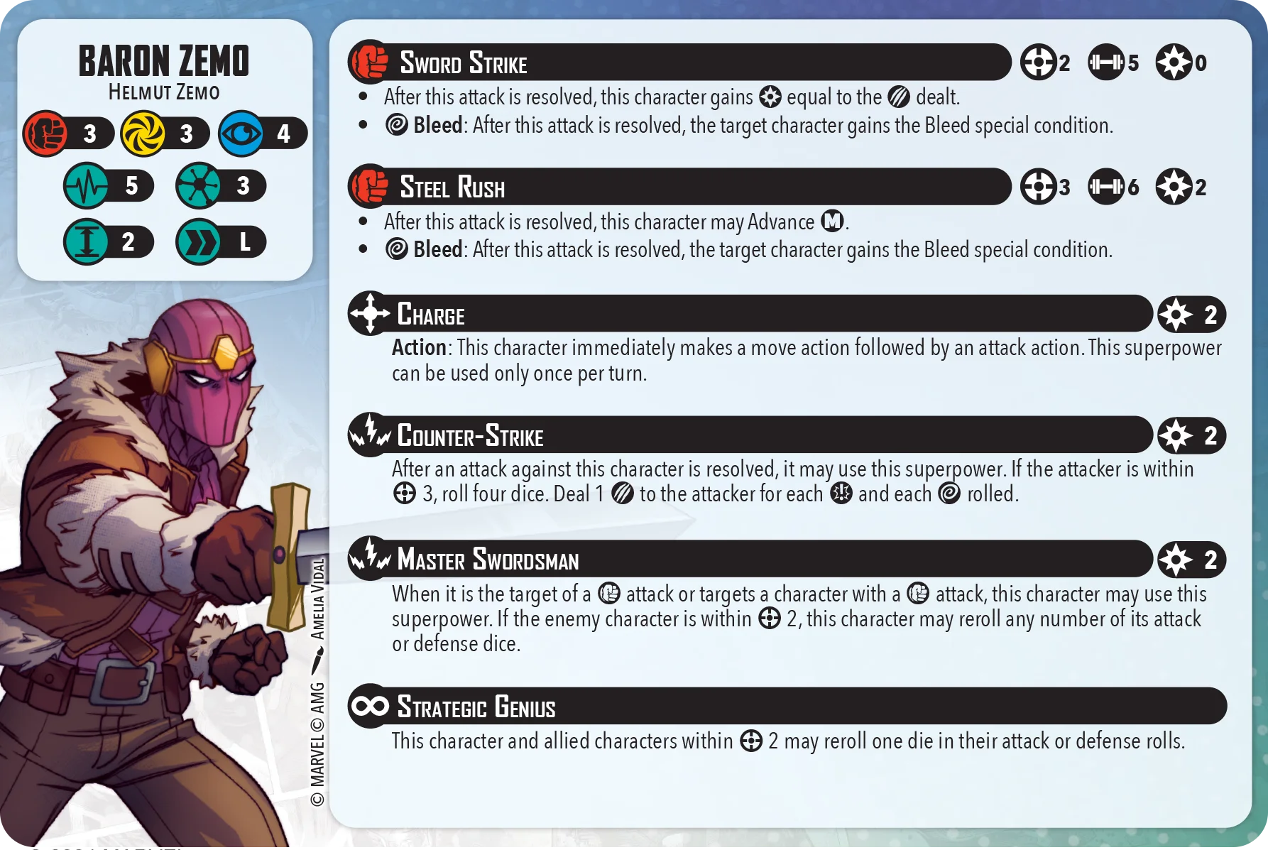 Baron Zemo one of the top models in the game and he does need to be brought back in line with the curve. At the least I think he could go from a Long mover to a Medium mover pretty easily. His Steel Rush Spender could cost more Power as well. Currently for only 4 Power you could target an enemy within Range 2 and get a 6 dice attack with re-roll any number, re-roll one from strategic genius, on a Wild give the defender Bleed, and also get a free Medium move after the attack is resolved. For another 2 Power you could also be able to Charge into the same sequence.