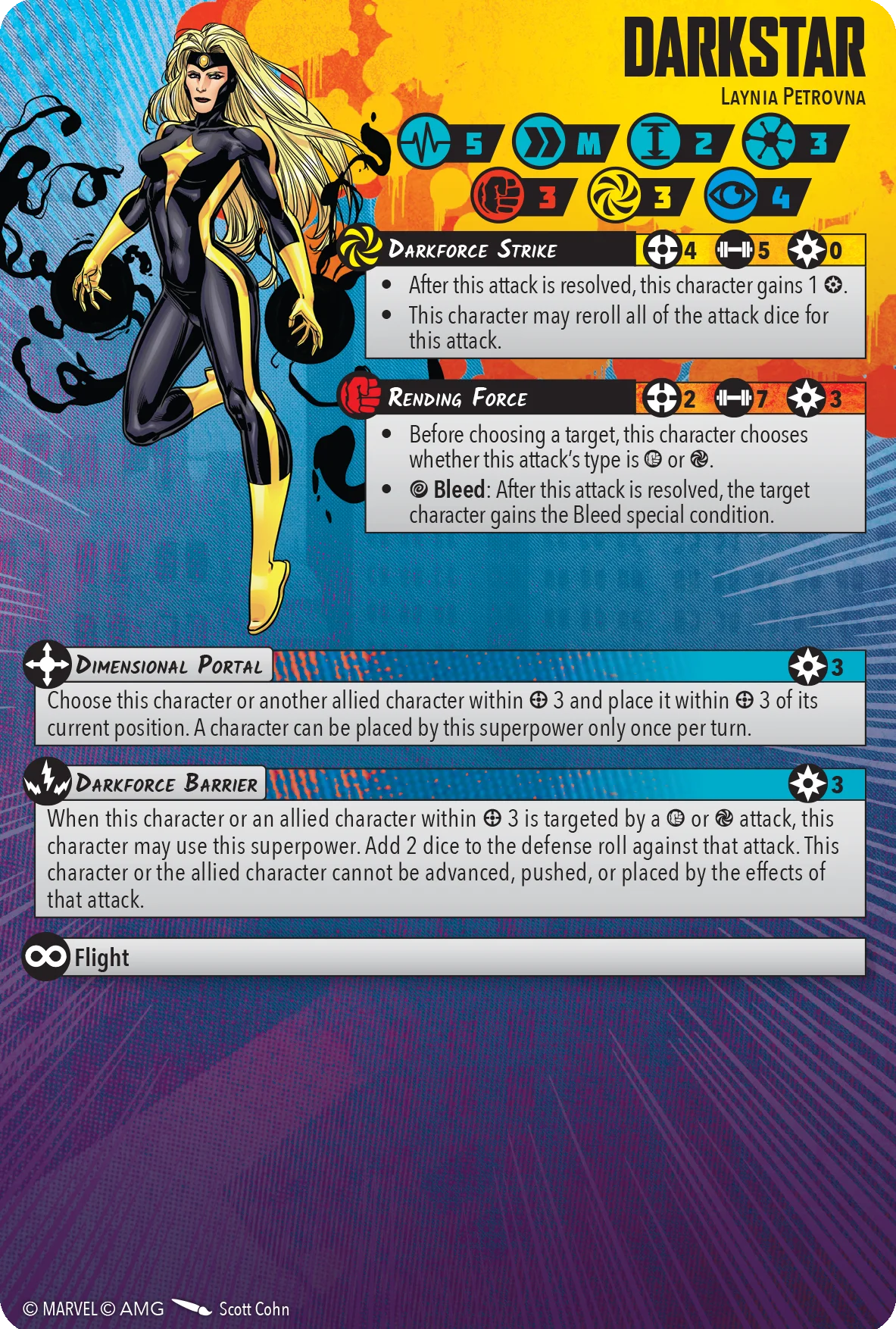 This Winter Guard support piece has a defensive stat line of 3/3/4 and a health pool of 5/5. Her defensive tech in the form of Darkforce Barrier could be expanded to add 2 defense dice against any attack type or Dodge roll with the bonus of the allied character cannot be advanced, pushed, or placed by the effects of the attack. She would also benefit from getting the Stealth superpower since she wields the Darkforce power which presumably can hide her from long range attackers.
