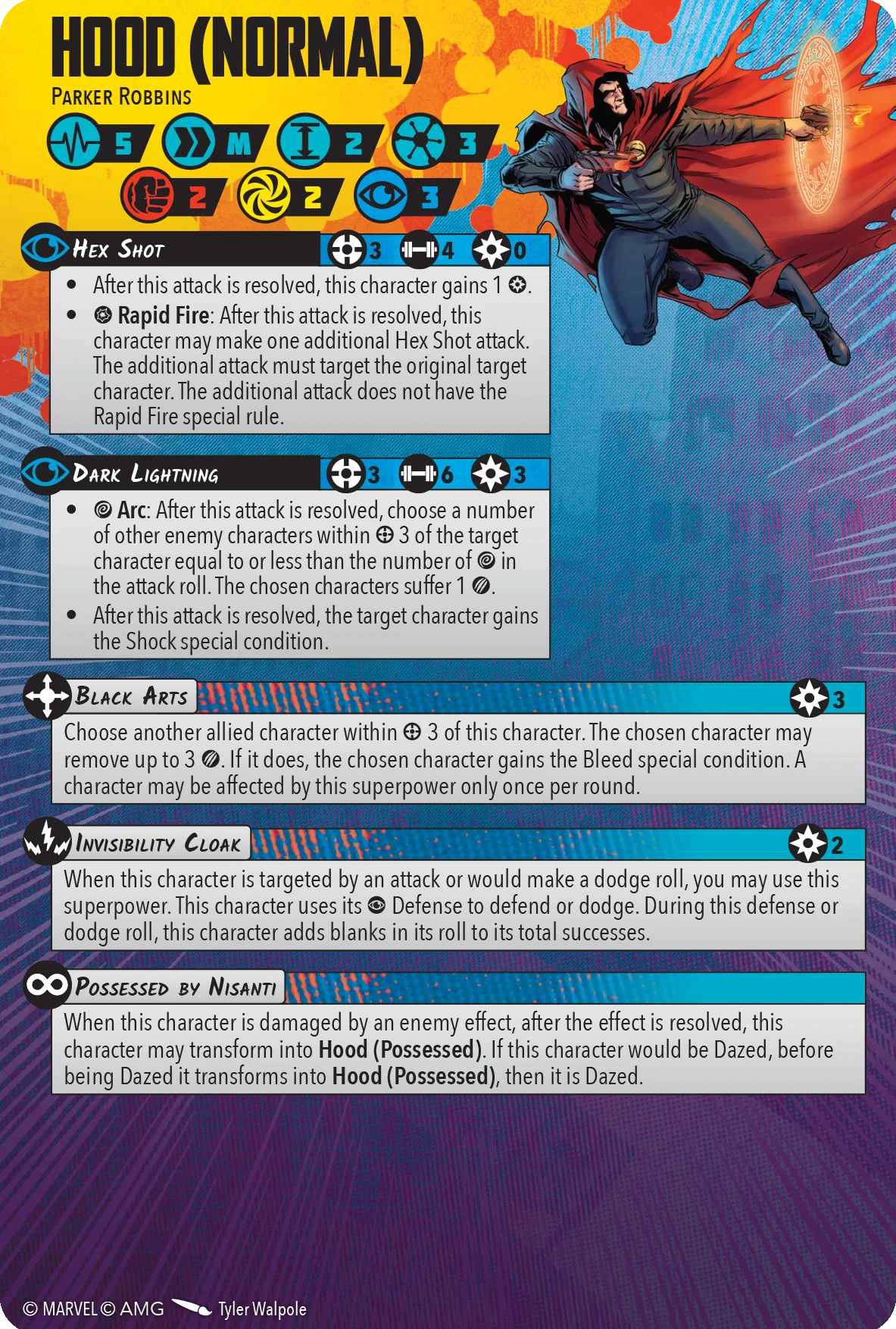 First, I think changing his Mystic defense to 4 dice and also changing his health pool to 6/5. It would be a bigger payoff for using his Invisibility Cloak. This would also be synergistic with the defensive tech on his Possessed form which reduces damage from an enemy effect by 2 to a minimum of 1. Secondly, I think we can change his defense dice on the Possessed side to 4/2/2 which will reflect his Mystic Vulnerability but make him much tougher to other attacks. Lastly, he has an Invisibility Cloak, this guy should have Stealth on his Normal form! He looks like any street level thug in a blood red cape!