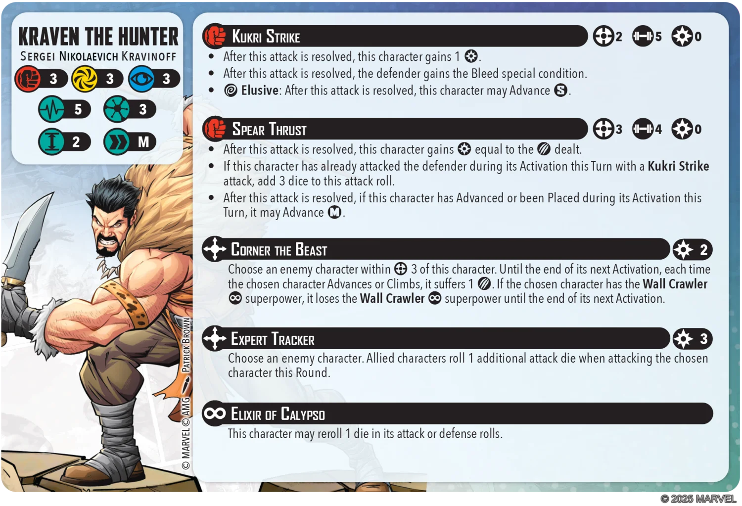 Kraven is another pretty weak Spider-Foe with a 3/3/3 defensive stat line and 5/5 heath pool. Kraven does get a re-roll on attack and defense rolls but that isn’t really cutting it anymore. Kraven stalks through the forest hunting his prey, he should get Stealth! Kraven also traverses on the tree tops while in the jungle and on the tops of buildings when in the urban jungle. He should get Wall Crawler!