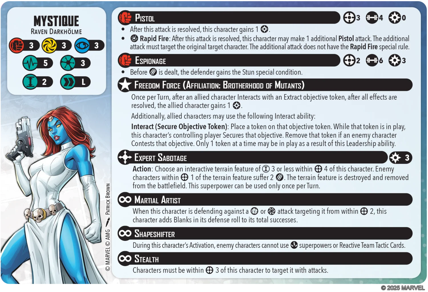 I think she definitely needs Stealth, but she’s also a character I could see getting an even better form of Stealth since she’s a shapeshifter known for her ability to slip in and out of even the most secure sites undetected. Giving her Super-Stealth (only able to be targeted from within Range 2) would definitely make her more survivable, especially paired with Martial Artist. It would represent your opponent not realizing Mystique is there until they’re right next to her and by that time she’s close enough to do Martial Arts on you.