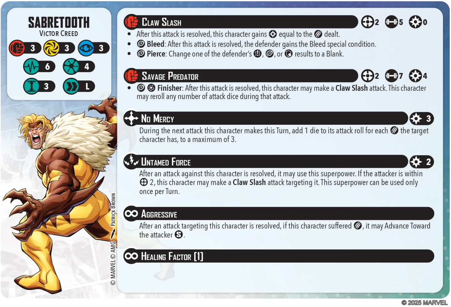 Sabretooth: 3/3/3 defensive dice with 6/6 health pool and Healing Factor 1