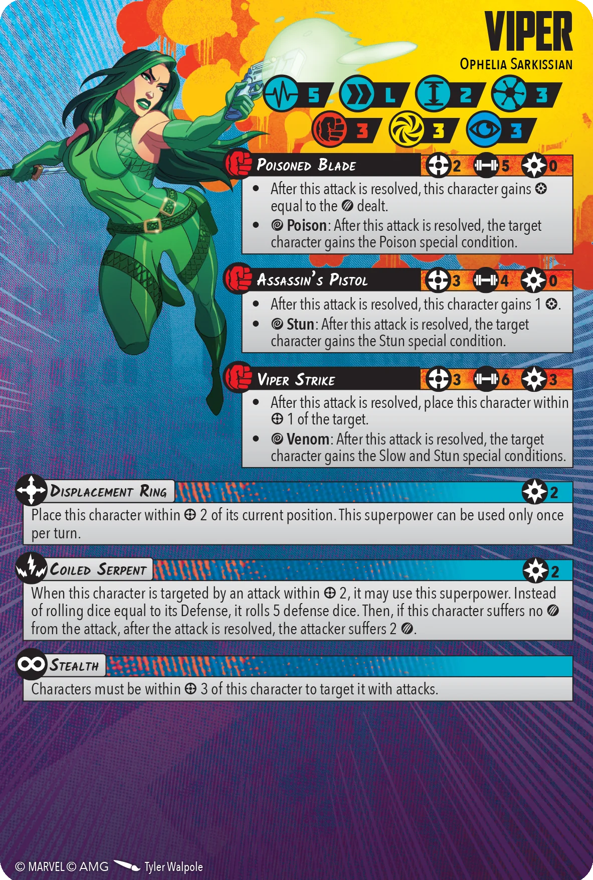 Viper’s Coiled Serpent makes her pay 2 Power and has to be within Range 2. I would rather Viper had a Enhanced Agility effect like Gambit to pay 2 Power and do a Damage to the attacker then advance Short. Alternatively giving her a Tricks and Traps superpower which can go off when an enemy ends a move within Range 3 of her and if she does damage she can advance Short. Perhaps in either one of those effects she can also automatically give out Poison or another special condition?