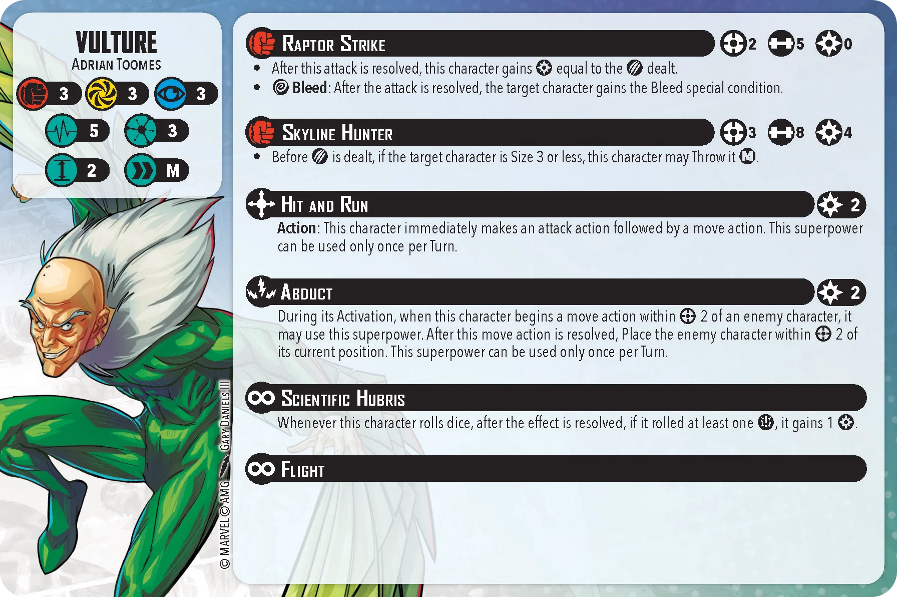 Vulture is a more recent release but he’s in line with the weaker 3 Threats in the game. He has a 3/3/3 defensive stat line with 5/5 health pool and no defensive tech. Even if the rest of his card was exceptional (it isn’t) he probably would still be killed off the table before being able to do much. He has to either get a buff to his defenses like a 4/3/3 stat line with 6/5 health or get a superpower similar to Archangel’s Wing Shield. Wing Shield at the cost of 2 Power adds to 2 defense dice against a Physical or Energy attack or Dodge roll.