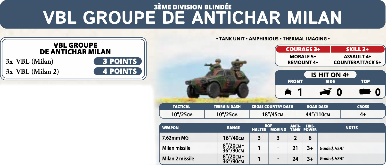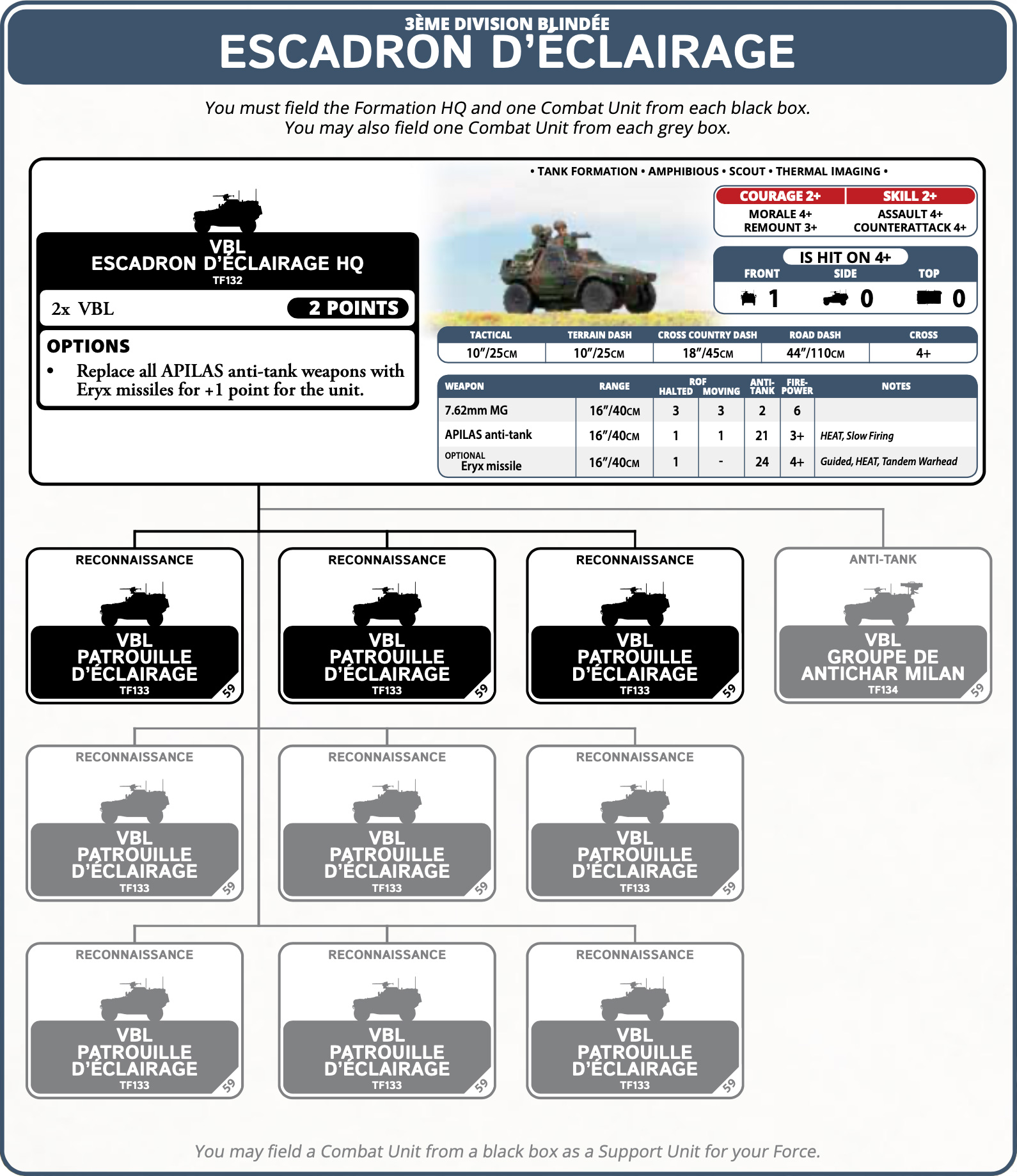 The article centers on the Escadron d’Eclairage, a formation built around the Panhard VBL, and it presents the unit as fast, flexible, and dangerous when used with discipline. Moreover, players can field standard VBLs with APILAS rockets or upgrade to Eryx missiles for harder anti-tank punches, while VBL Milan teams add longer-range threat projection.