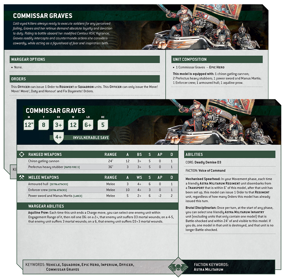 More importantly, Mechanised Spearhead lets nearby Regiment units disembark within 6 inches and immediately receive a free Order. So, this looks built for a proper mechanised shove, with Chimeras and Centaurs vomiting infantry onto contested objectives. Graves can also be taken on foot, where she still functions as a hard-edged Leader with the same Brutal Disciplinarian ability.