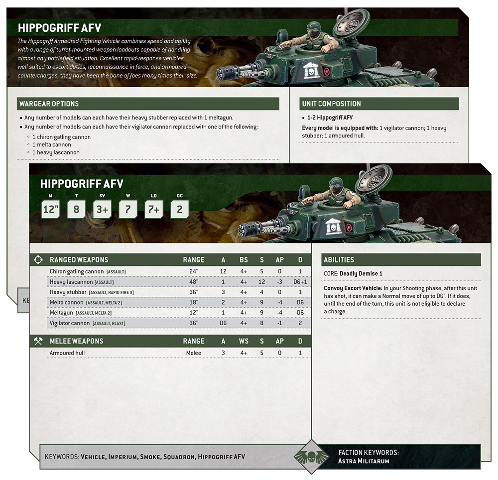 Meanwhile, the Hippogriff AFV fills a different role. It is a lighter, faster gun platform with four main weapon options, plus either a heavy stubber or meltagun.