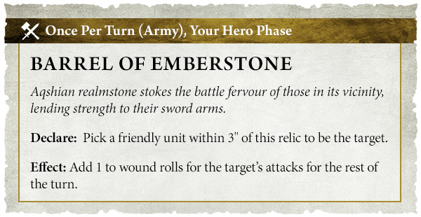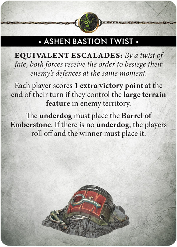 The Barrel of Emberstone appears through the Equivalent Escalades twist, gives both players bonus points for controlling the large enemy-side terrain feature, and hands out +1 to wound for a nearby friendly unit once per turn. So, even a basic unit can suddenly hit like a truck.