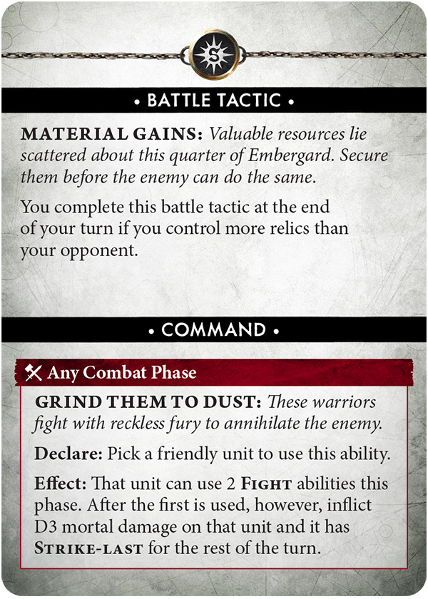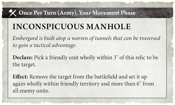 That relic is wonderfully nasty, because it lets a unit redeploy through Embergard’s tunnels into friendly territory more than 6 inches from enemies.