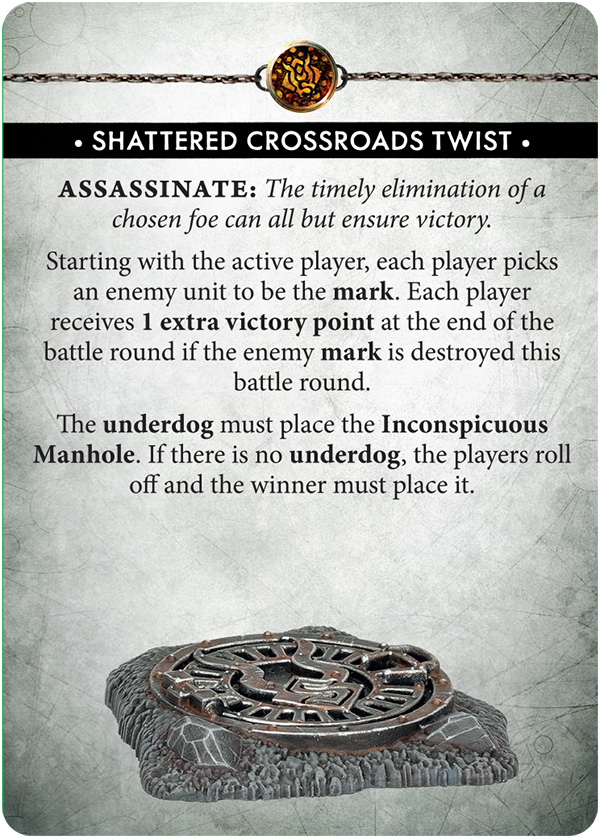 Material Gains then raises the stakes further by rewarding whoever controls more relics. On the other board, Assassinate lets each player mark an enemy unit for extra points, while the underdog places the Inconspicuous Manhole.