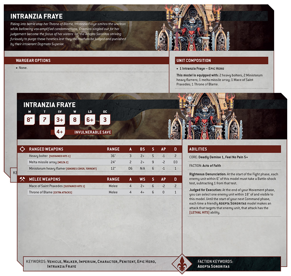 However, the real flavor comes from how her authority spills outward. Her Righteous Denunciations reinforce the image of a commander whose words hit almost as hard as her guns. Meanwhile, she can mark an enemy unit as Judged for Execution, which then drives nearby Sisters to hit harder with extra zeal. So, she reads like a front-line force multiplier who punishes targets and helps the army focus its fury where it matters. That is a strong fit for Sororitas players, because it mixes doctrine, spectacle, and raw pressure in one dramatic centerpiece.