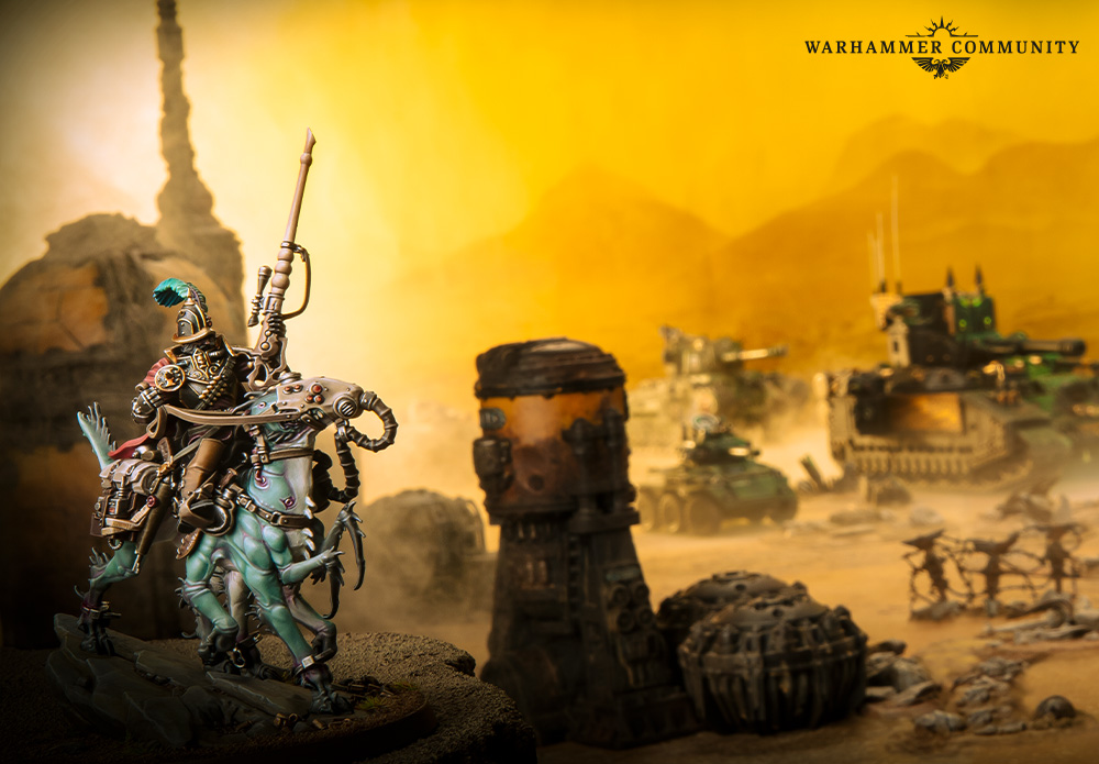 Warhammer miniature knight riding a dragon-like creature leads a desert battle with tanks and ruined structures; Warhammer Community logo top right.
