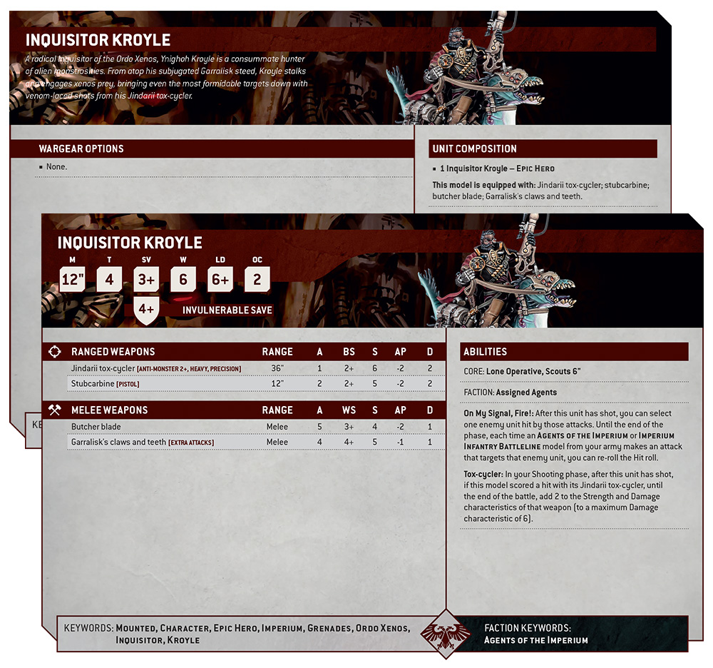 Inquisitor Kroyle goes in a different direction, and honestly that contrast sells the pair well. He is not a blunt instrument. Instead, he looks like a hunter built to stalk key targets from awkward angles. A 12-inch Move and Lone Operative give him real freedom to pick his fights, while his 36-inch rifle keeps him well back from the worst return fire.