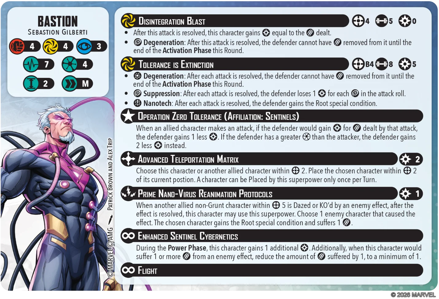 I also cannot be happier with his Spender. Usually 5 Power is a lot to be paying for a Spender attack but this is a Beam 4 template with 8 dice. Bastion can teleport himself into the perfect Beam position and throw multiple 8 attack dice pools. Plus, each type of success result on your dice is a different and great effect. They all synergize with his goal of dealing damage to attrition your opponent off the board while denying them Power and wrecking their Power/action economy.