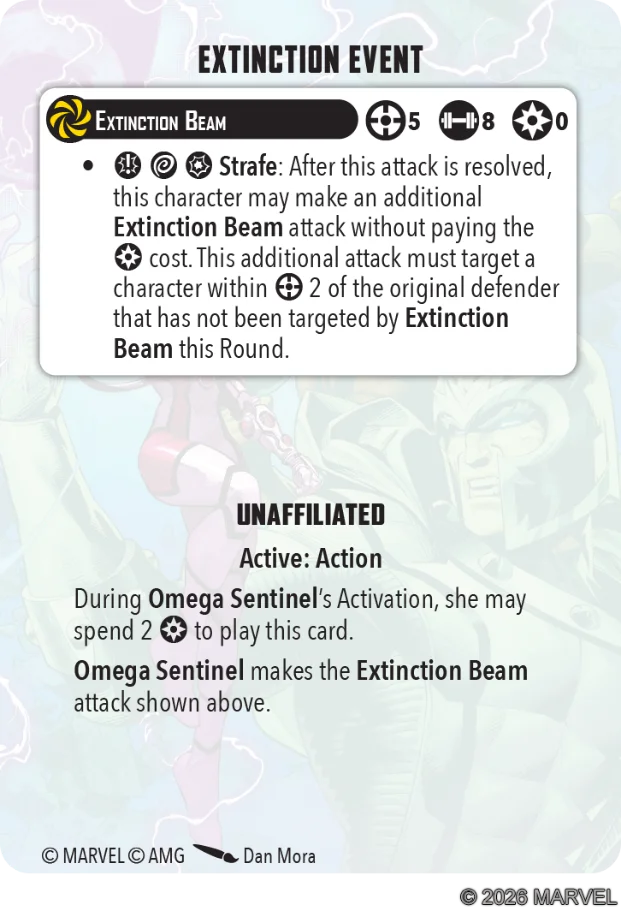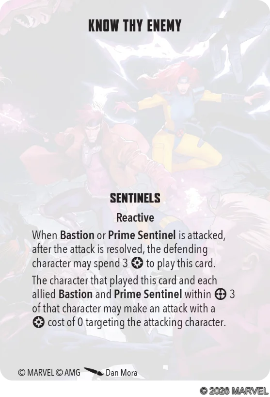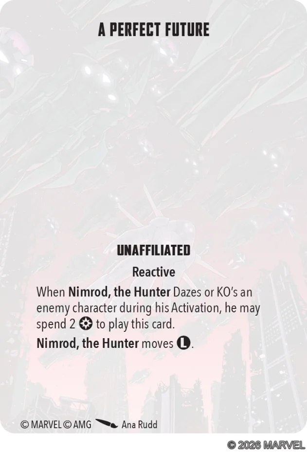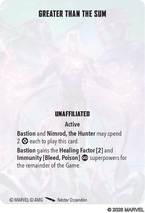 This is a team-up card for Nimrod and Bastion that gives Bastion extra survivability. Bastion is already a pretty survivable model with his good defenses and damage reduction. While Healing Factor synergizes a lot with that, this card isn’t boosting your teams’ attacks which is what I think you want to be doing under Bastion. In fact, it’s taking Power away from Nimrod and Bastion to play this card. Power that could instead be used for your attrition gameplan.