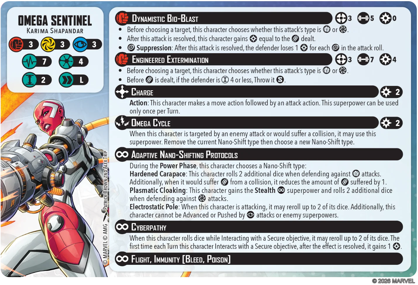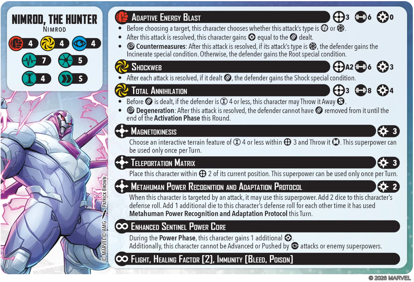 Moving on to the big robot of this box, we have Nimrod. He’s a very tanky 5 Threat model with 4/4/4 defensive dice and 7/7 health pool. His defenses are boosted through his superpower that adds defense dice and also scales for each time it’s been used in the Turn. In addition, he has Healing Factor 2 so his effective health pool is actually going to be much higher than what’s printed on his card.