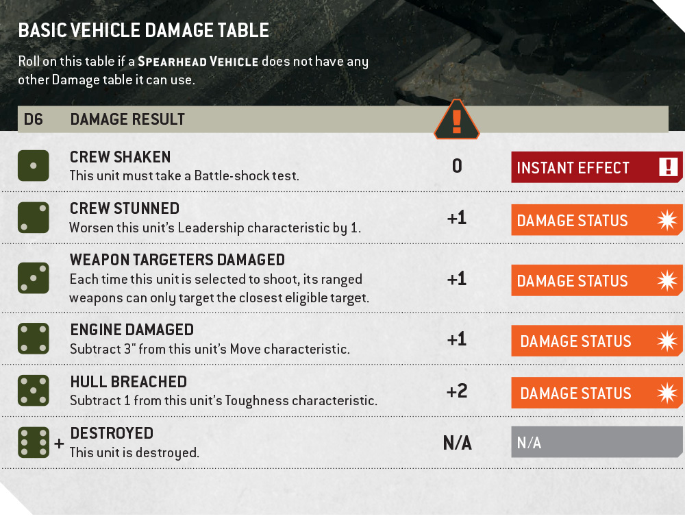 So, the focus lands squarely on big tanks and big stompies. Instead of simply dying on their last unsaved Wound, these units roll on damage tables, and Damage Tokens make worse outcomes more likely.