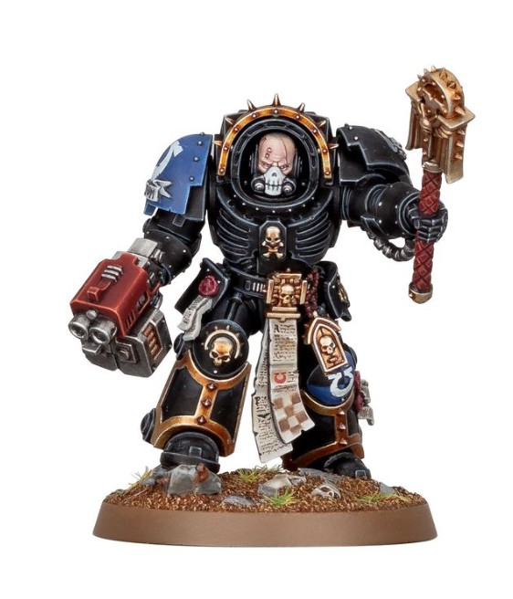Warhammer 40k Space Marine Terminator miniature in black armor with skulls, wielding a large hammer and standing on a textured base.