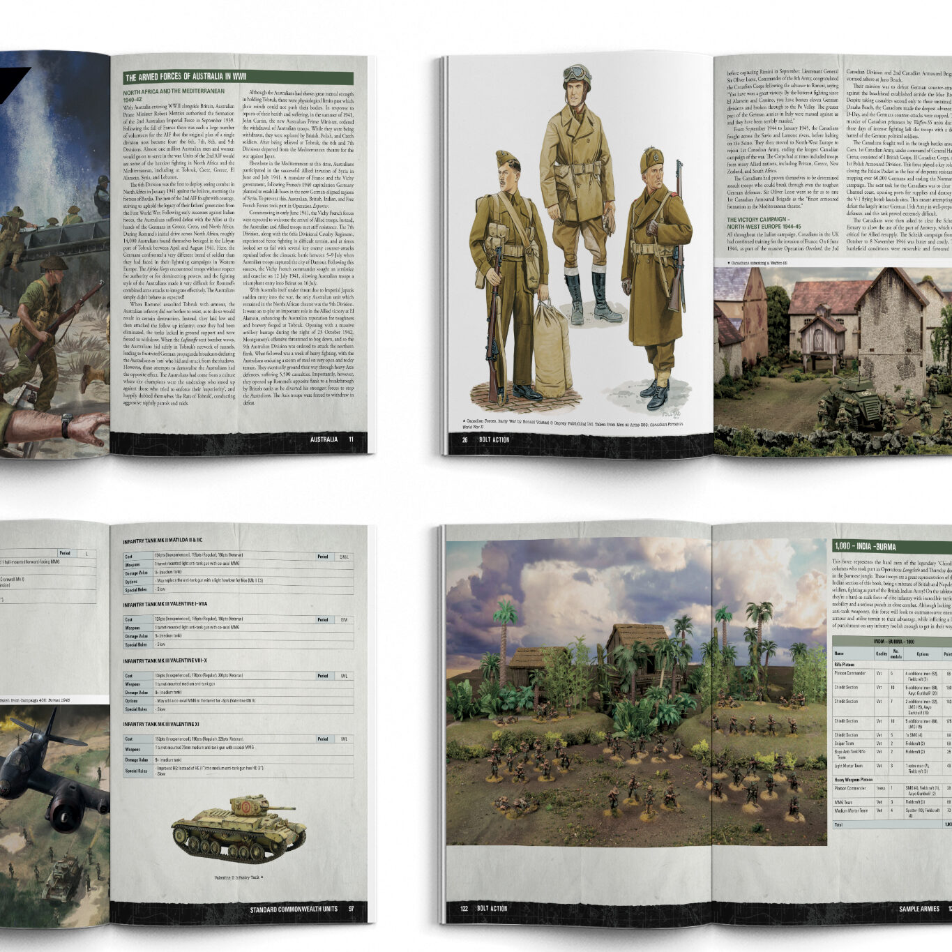 The clever bit is how the book is structured. First, it includes Standard Commonwealth Units drawn from Armies of Great Britain. However, those shared units are reprinted here, so the new book works on its own. Then each nation gets its own section, with background, artwork, photography, special rules, unique units, and a force selection guide.