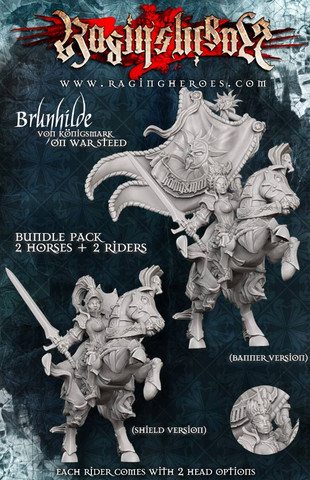 Kit includes 2 horses with riders bearing long sword, one with huge banner and one with shield, with 4 head options: