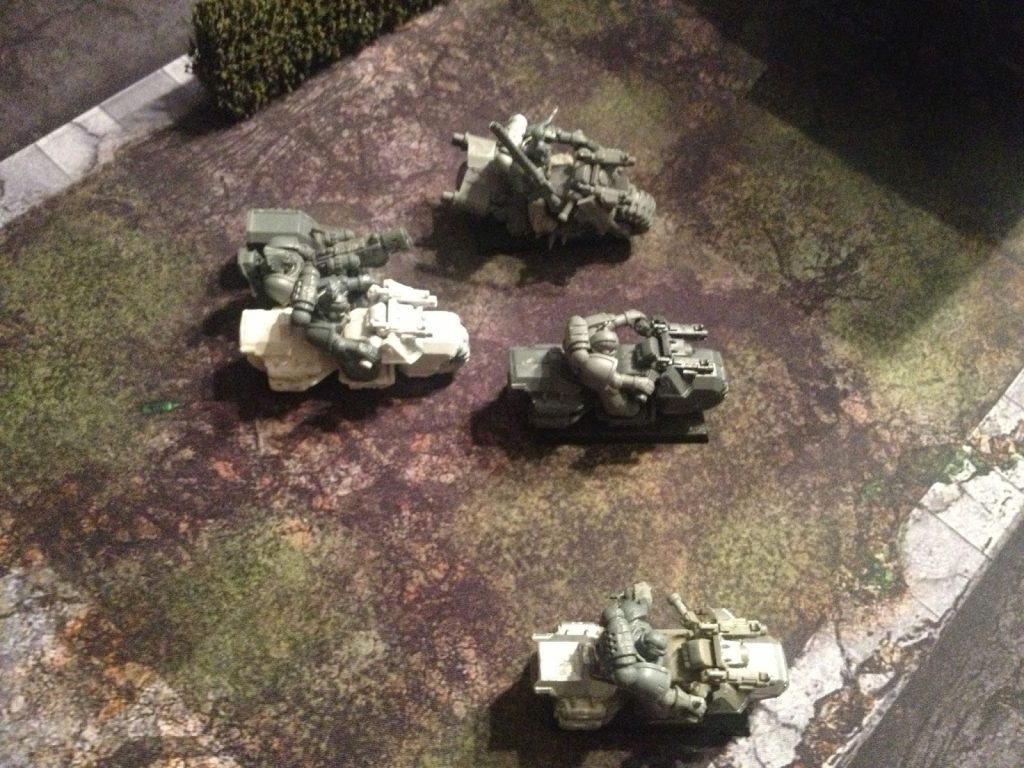 The Speeder with the Scouts was going to infiltrate, but I completely forgot about it, so by the end of the Space Wolves turn 1 I remembered, and so we decided to place it in reserves, arriving from my board edge. The 3 Drop Pods were also in reserves, of course, and the 10 man squad combat squadded.