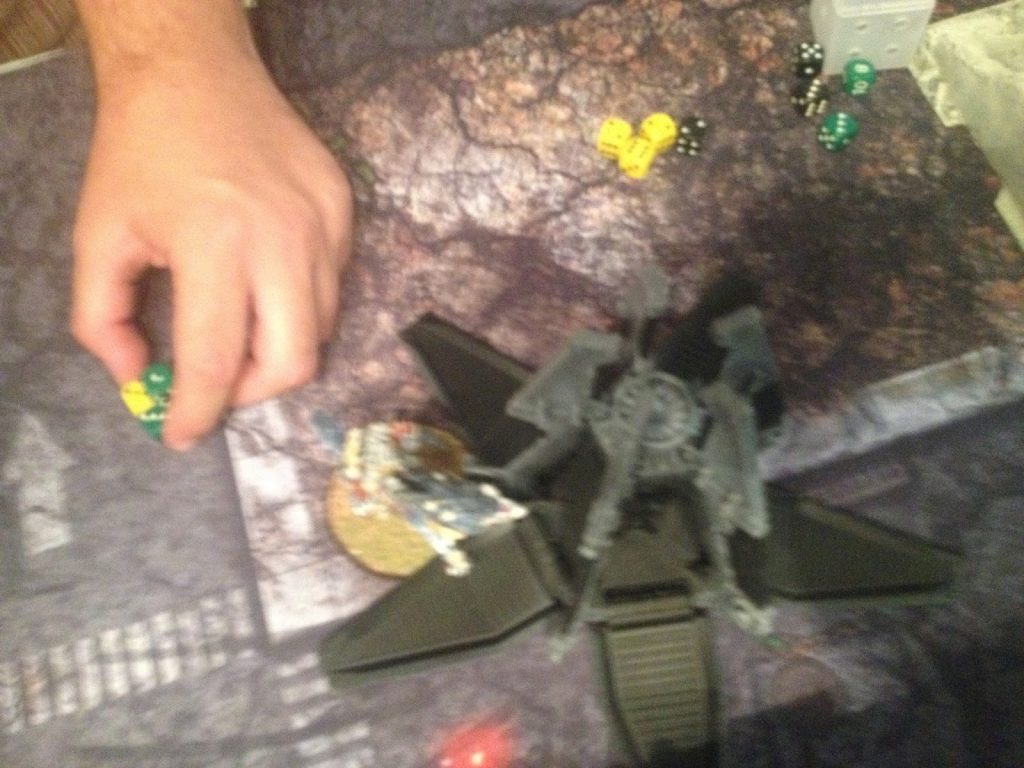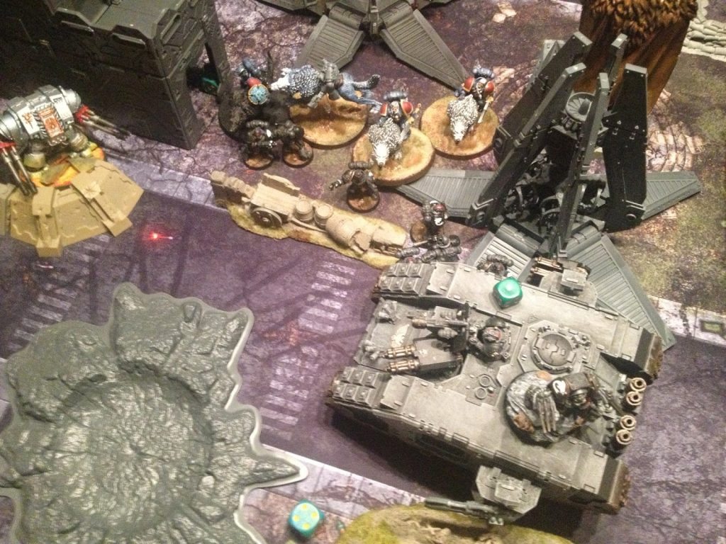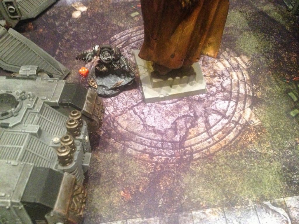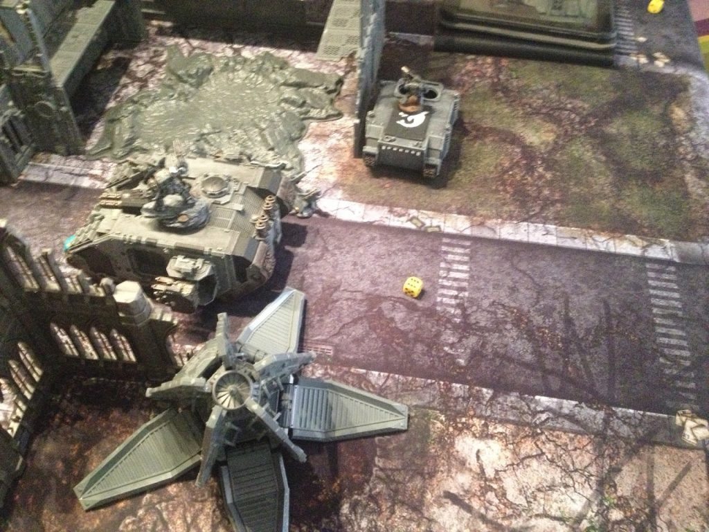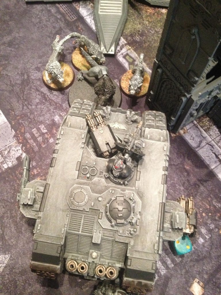 The Land Raider shoots at the back of the Murderfand, stripping the last hull-point, with the last failed cover save!