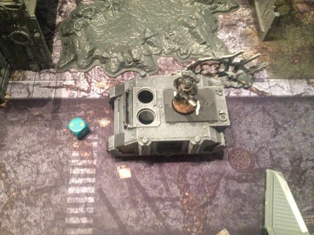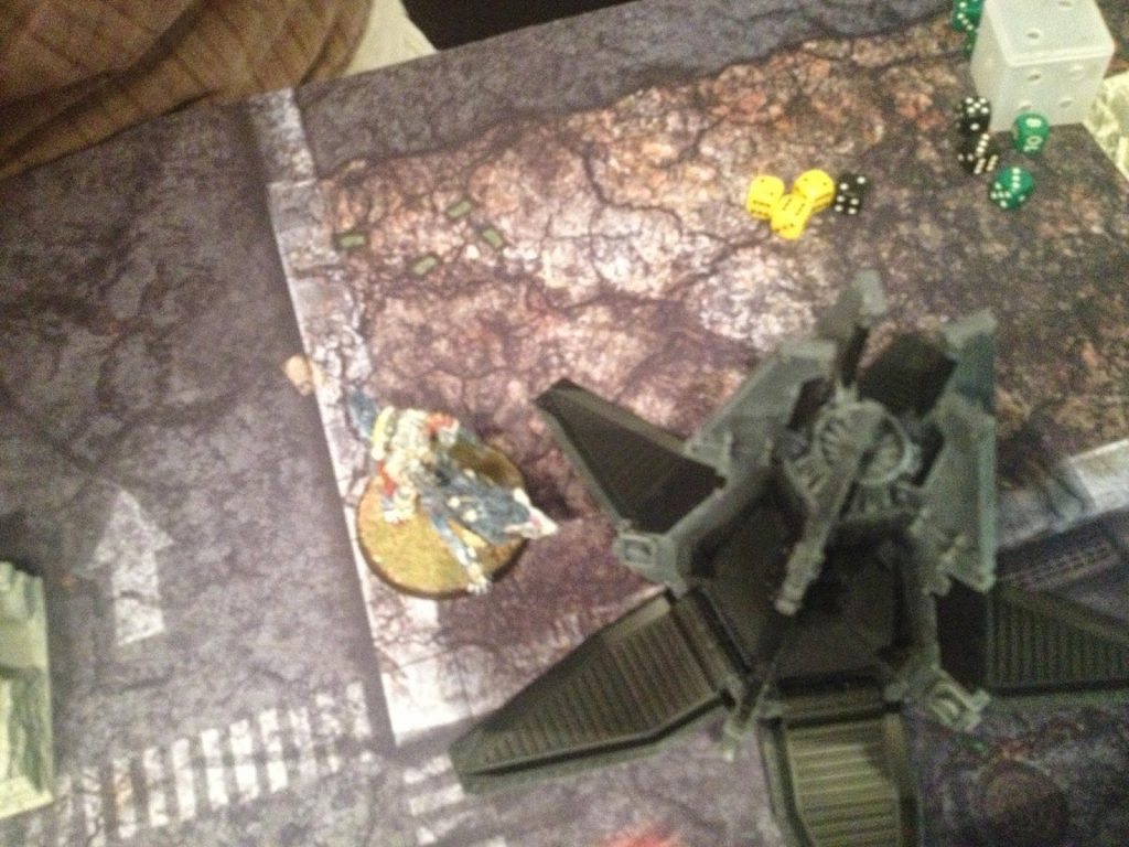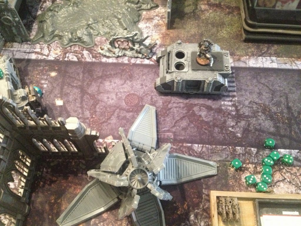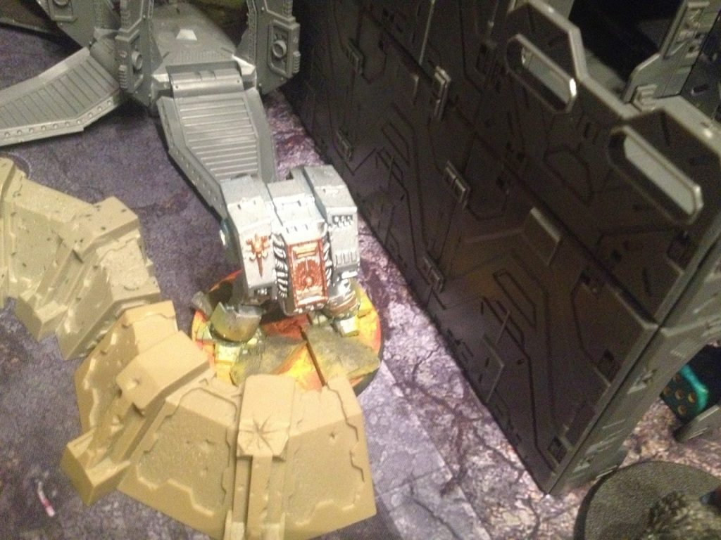 The arm-less Murderfang tries to destroy a Drop Pod, for another Kp.