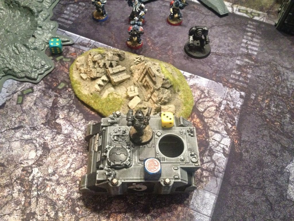 I placed the Land Raider, with Tyberos and the terminators inside, in the Objective 2,with 4+ cover from the big ruin. The Rhino with the meltagun to my right, out of LOS. The flamer Rhino ready to grab the Objective 4.