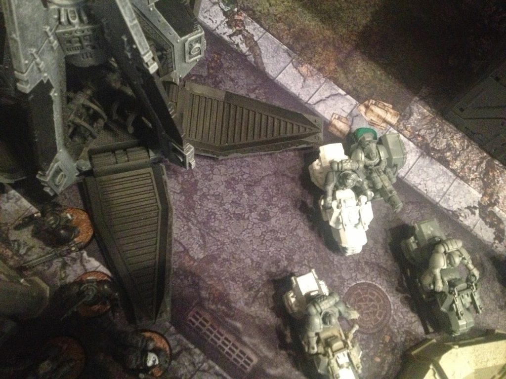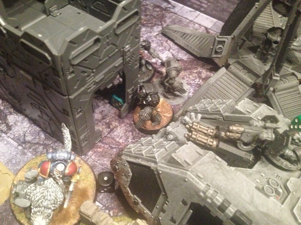 Aaargh this is becoming an uphill battle… The 5 tacticals hop off the Land Raider to help their brothers in the assault. Tyberos and the terminators, far from te action, can only hop in the Land Raider.