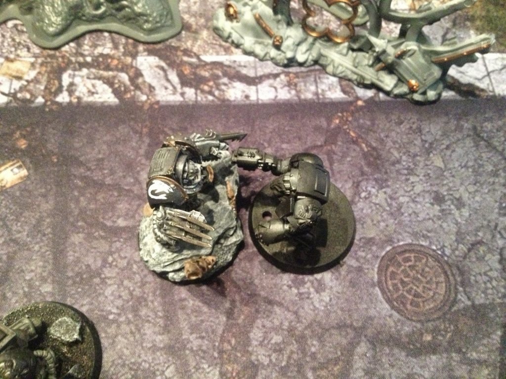 Tyberos fails like a newbie, and only wounds twice, but my opponents dice betray him, rolling a 1 and a 2, in that exact order, so the Wolf Guard and a grey hunter die. The terminators then proceed to finish up the rest of the squad, without suffering any casualties. They get the job done, and I get Firs Blood.