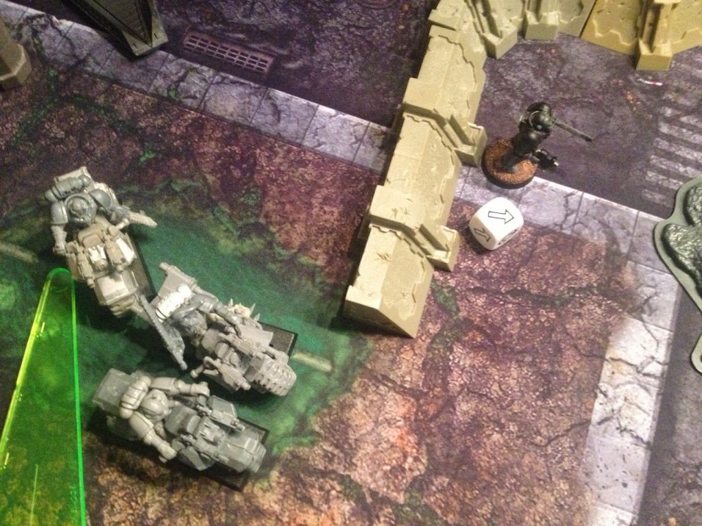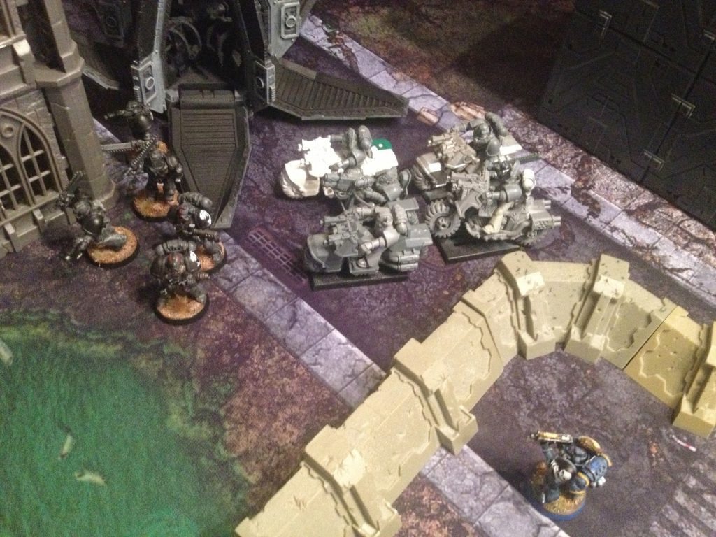 With the assault squad’s flamers, I fail misserably, doing nothing. Thanks to a lucky shot from the Drop Pod, I’m able to make a wound to the Attack Bike.