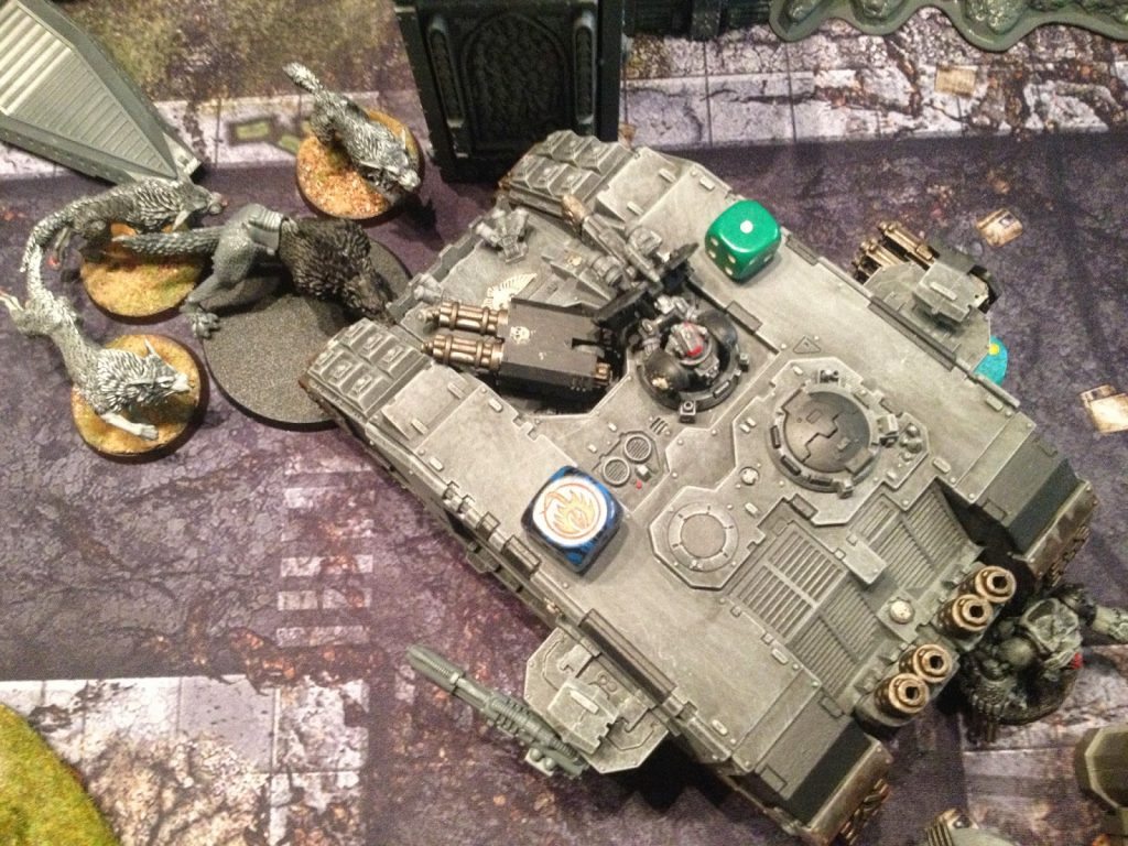 The Murderfang doesn’t show up. He gets in position to achieve “Blood and guts”, and “No prisoners”. He splits the Iron Priest from the thunderwolves to go for the Land Raider with his S10 attacks, while the thunderwolves go for the shaken Rhino