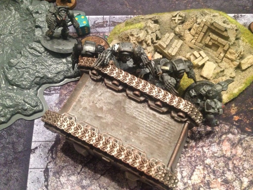 The 5 man squad with flamer hops in the Land Raider, which advances towards the centre.
