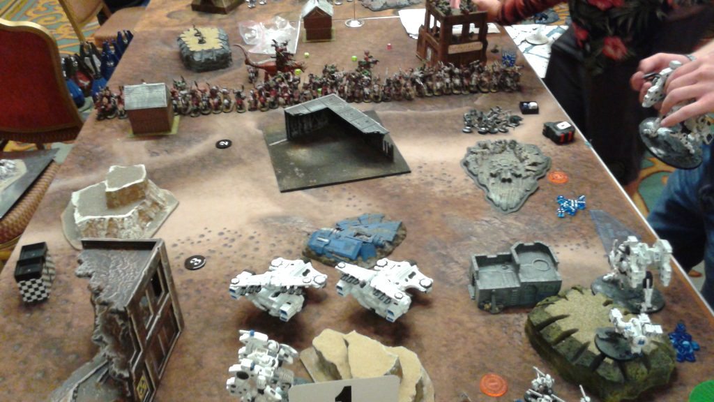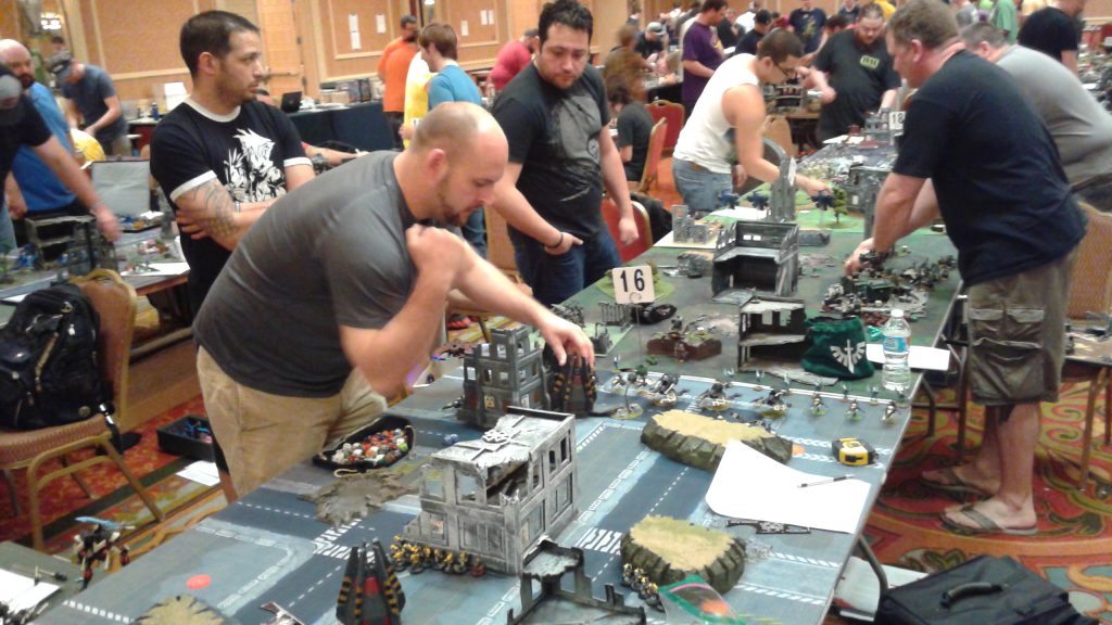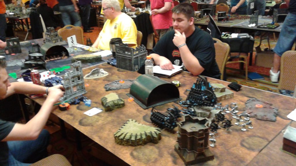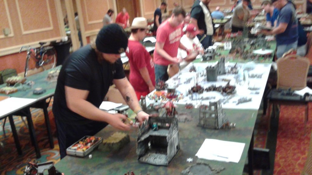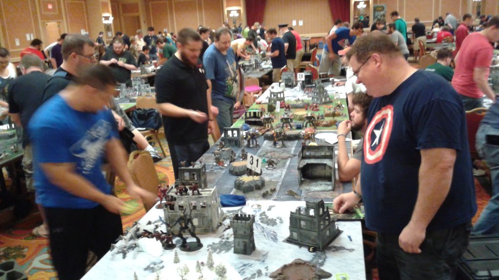 Space Marines are very popular as well, and we have several Battle Companies. I have been keeping an eye on these games are everyone that played them expressed that it felt overwhelming to face so many units, but that they enjoyed the games. Most of the folks asked said the Battle Company didn’t do that much damage, but was excellent at winning missions, which is what most of us expected. None of them made it into the undefeated bracket though (Edit: Mike’s list does feature a Battle Company and is in the undefeated bracket Game 4), as they got bumped out when facing armies with superior kill power or in the kill points mission which proved to trip most of them up. Only Nick Rose and his Scout/Centurion army has made the cut going into day 2 sporting a Space Marine CAD, and Mike Mckinney with his Blood Angels/Space Marine combo.