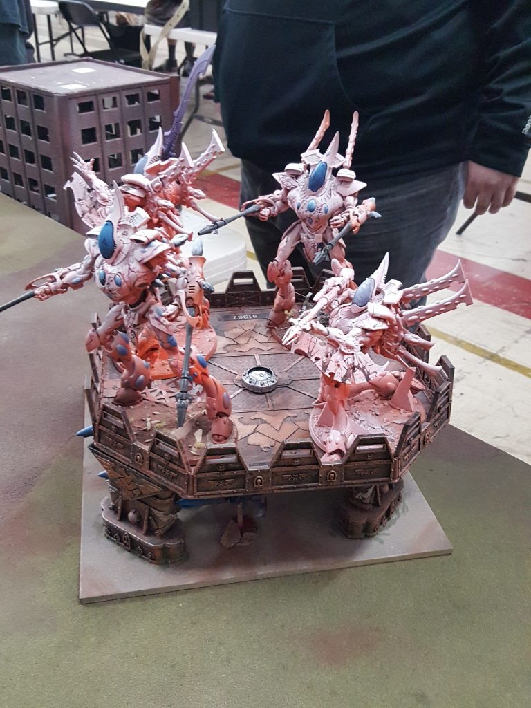So remember the five Knight army I saw when I walked into the hall and though ‘man if I have to go against that it will be a quick game’? Well, guess who I drew next? Not only was Ben running five WS and BS 5 Imperial Knights but he is also a REALLY good player so I knew I was in trouble. The game was a NOVA mission that revolved around taking and holding objectives that were worth varying amounts of points. The player that wracked up the most points by the end of the game wins. I only had a set amount of units that could put a dent in Ben’s army and they had to all be hitting and taking off hull points if I even had a prayer of pulling this game off. Boy was I fucked. Ben predictably ran 4 out of 5 Knights directly at my battle line with his armor 13 facing me and ion shields on point. In the end I took out one Knight and scratched the paint off of a couple more.