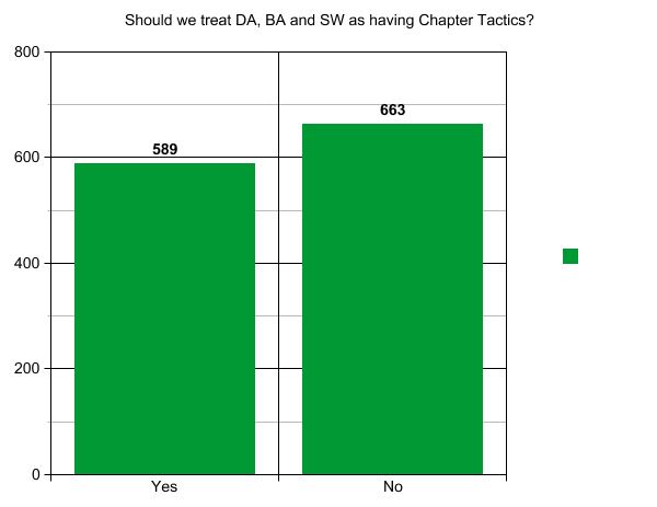 This vote went fairly predictably, IMO. The only question I felt really uncertain about the outcome was the question to count Dark Angels, Blood Angels and Space Wolves as having Chapter Tactics as they essentially do. It was a very close vote, but the community decided to maintain the status quo.