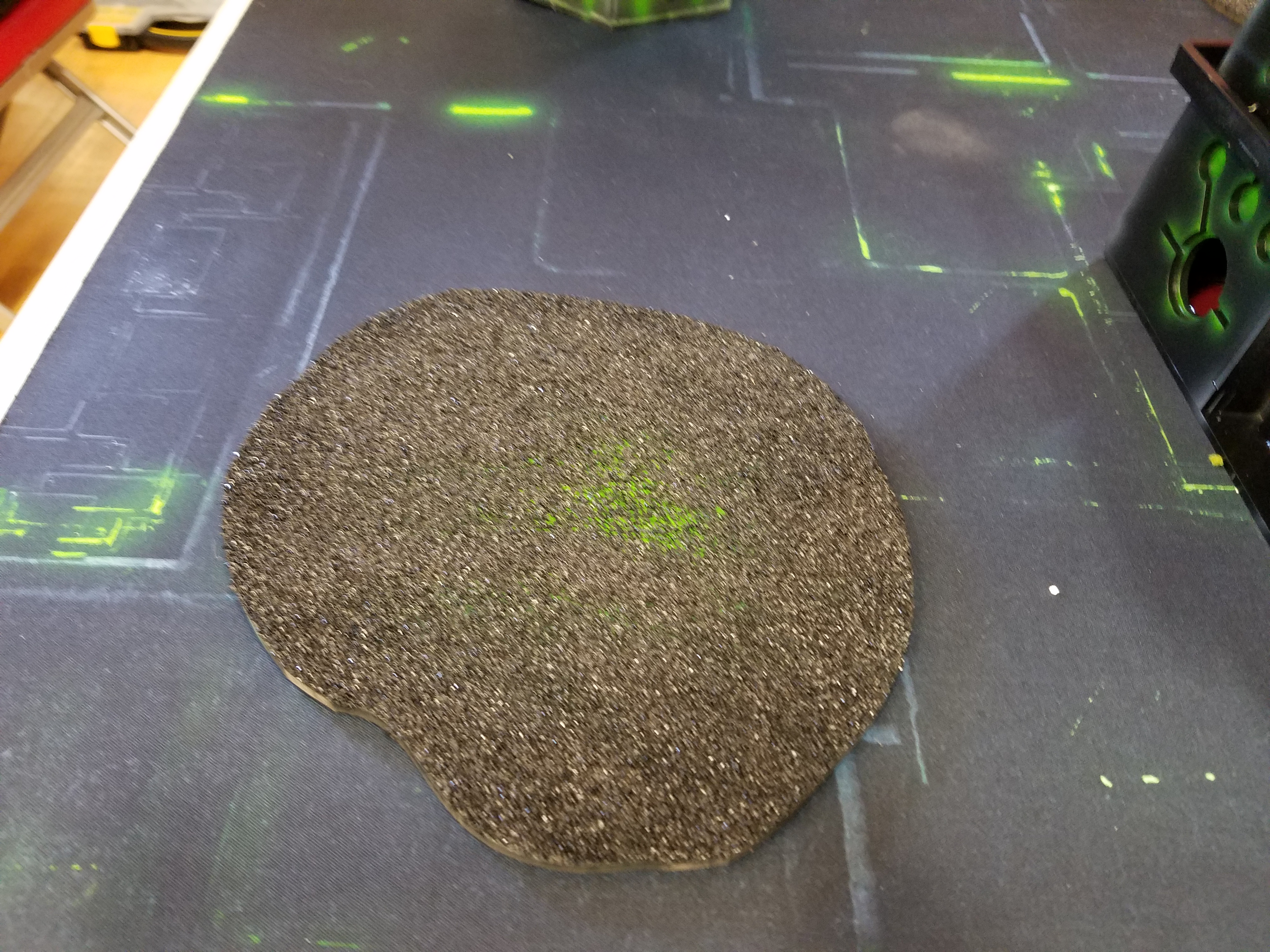 I set about creating a set of area style terrain that would fit the theme and think I found something. I took MDF board and cut it into nice circleish shapes, then painted them black with a green in the center. After that I flocked them with black aquarium sand and blasted it with a gloss coat. They will later get some green crystals to match and work like trees. I think my area terrain took the set up a notch and will add more flavor to the terrain as a whole.