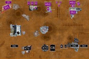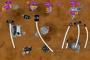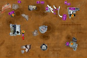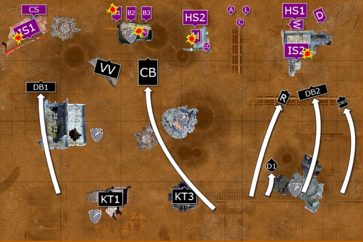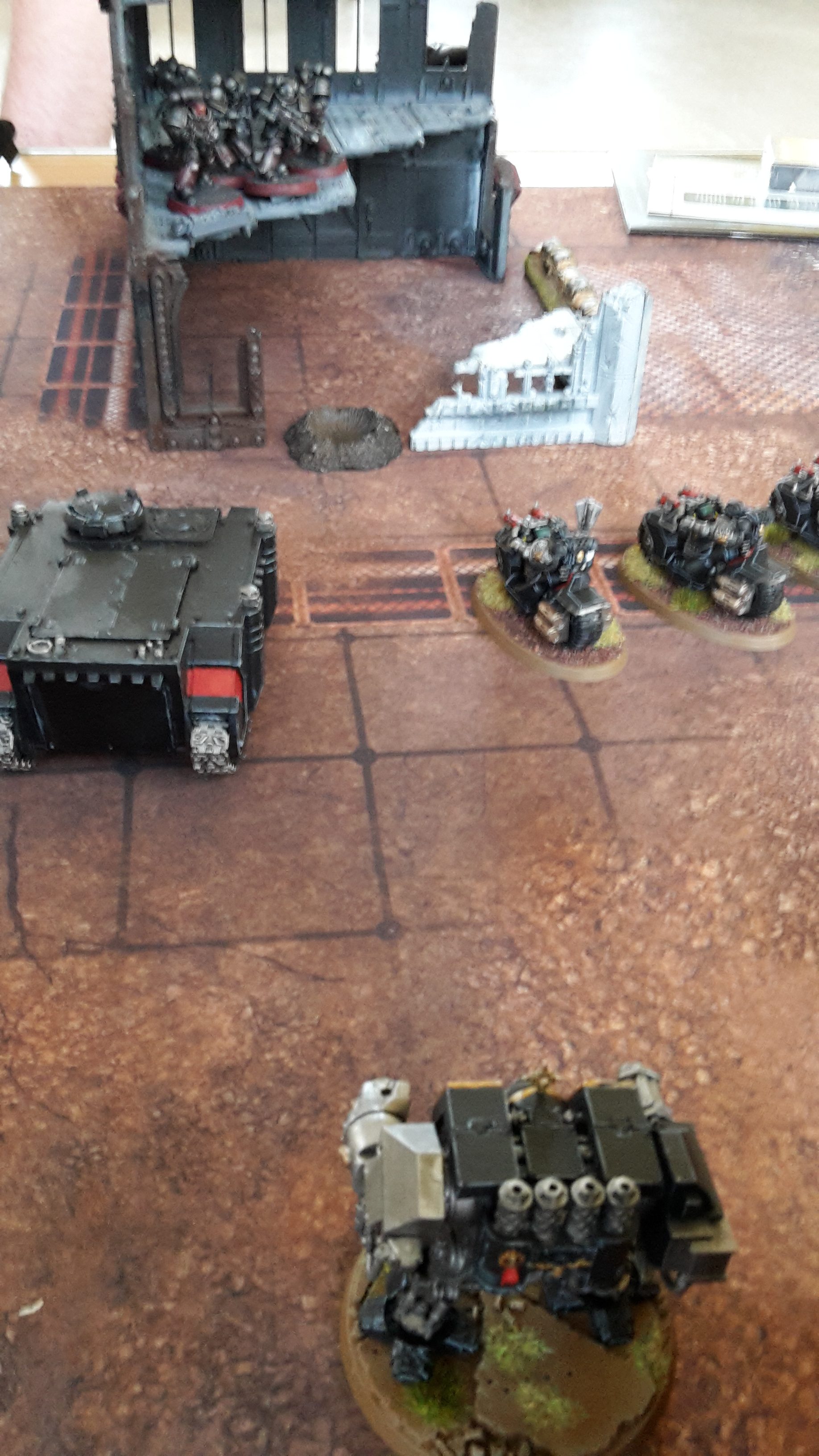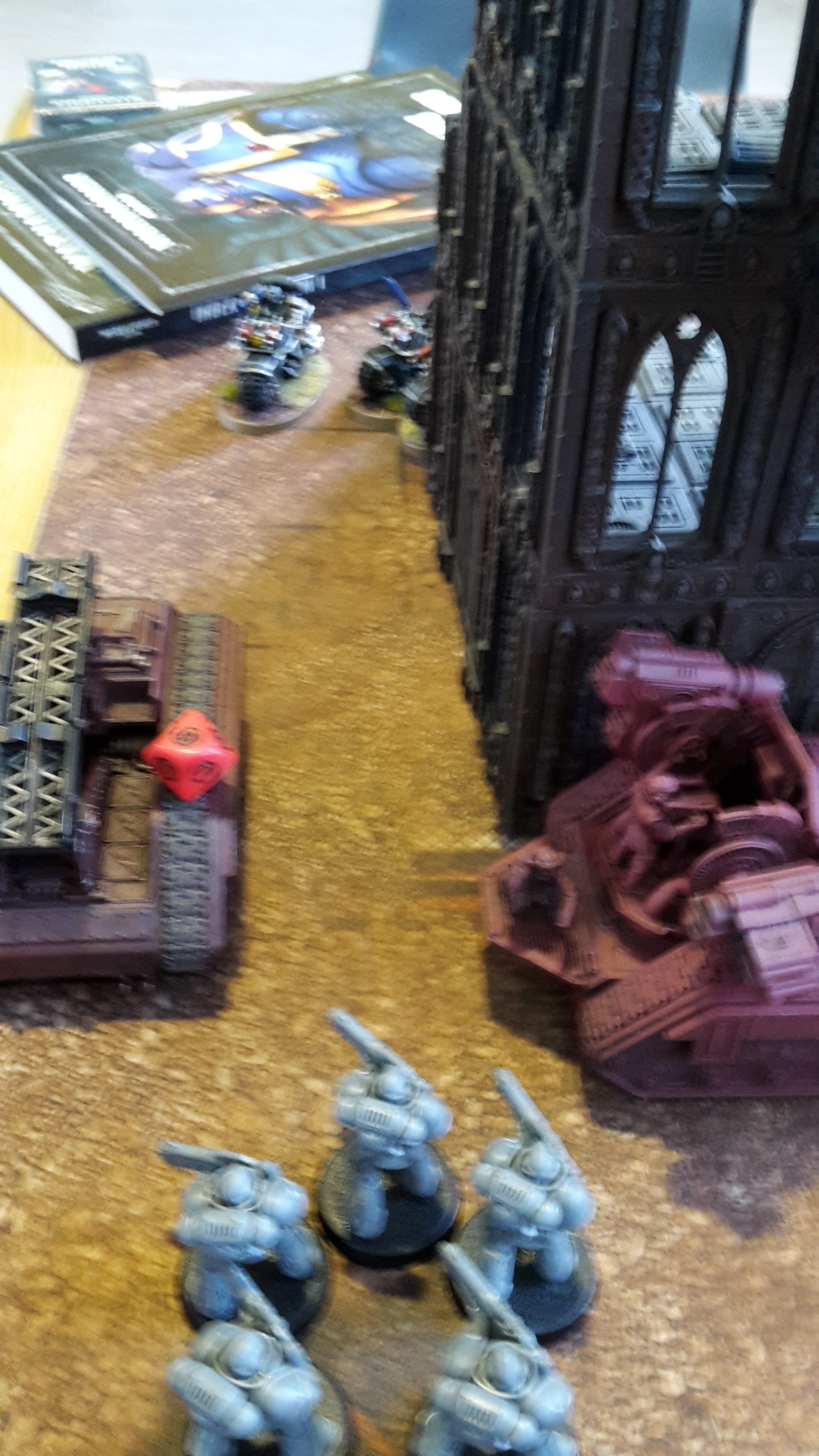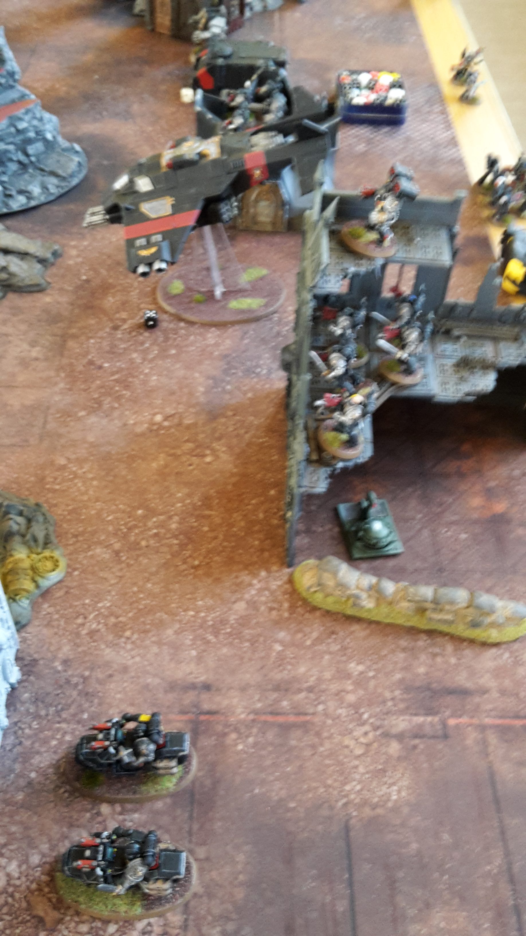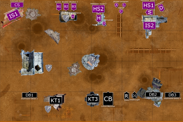 The mobile elements of the Deathwatch army advanced; the right flank advancing on the Primaris Marines in the ruins, while the Corvus sped towards the enemy Basilisks. On the left flank, the Deathwatch guided their Bikes through the ruins, as the Vanguard Veterans landed in front of the Basilisks.
