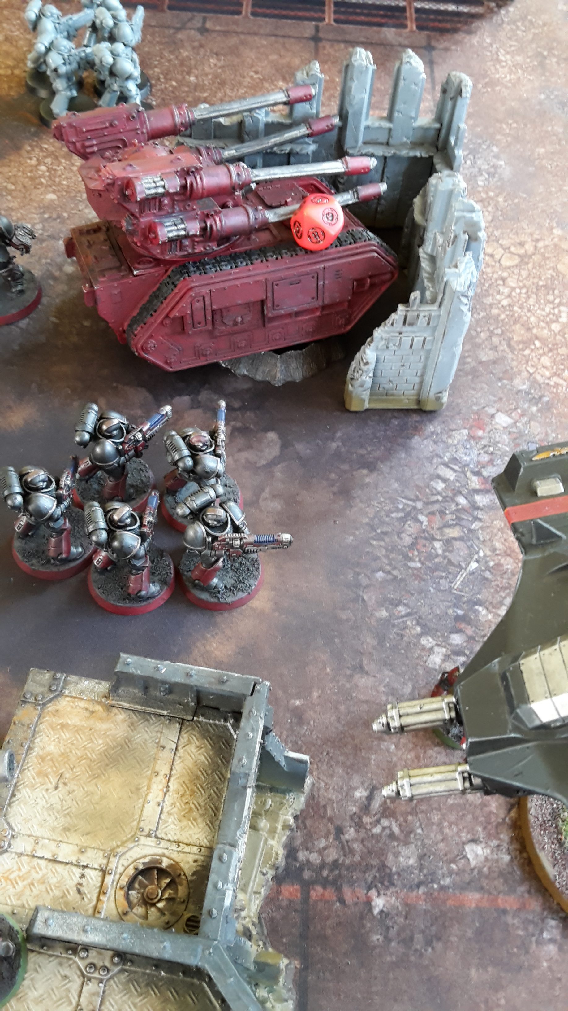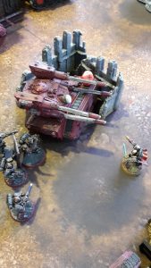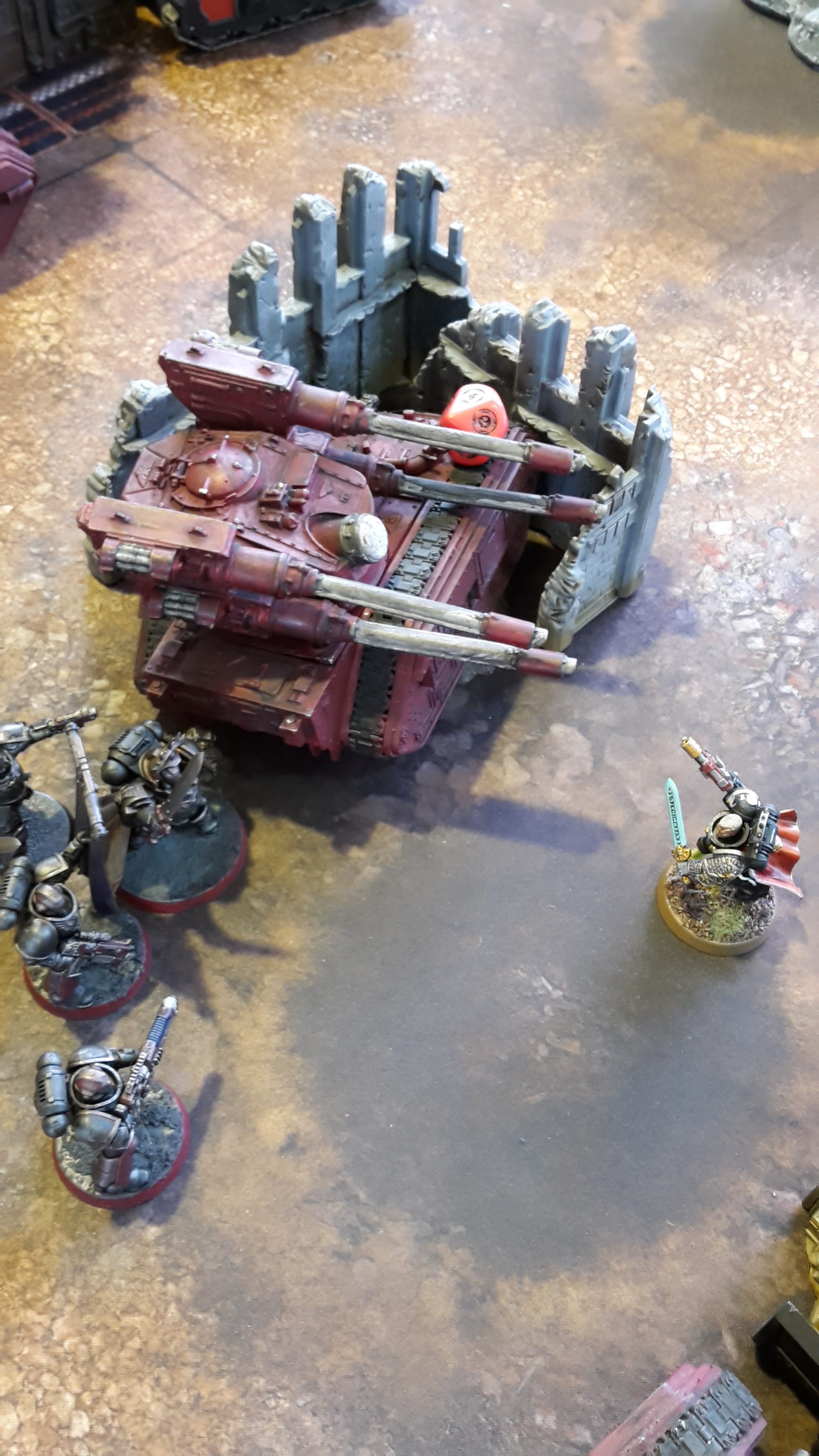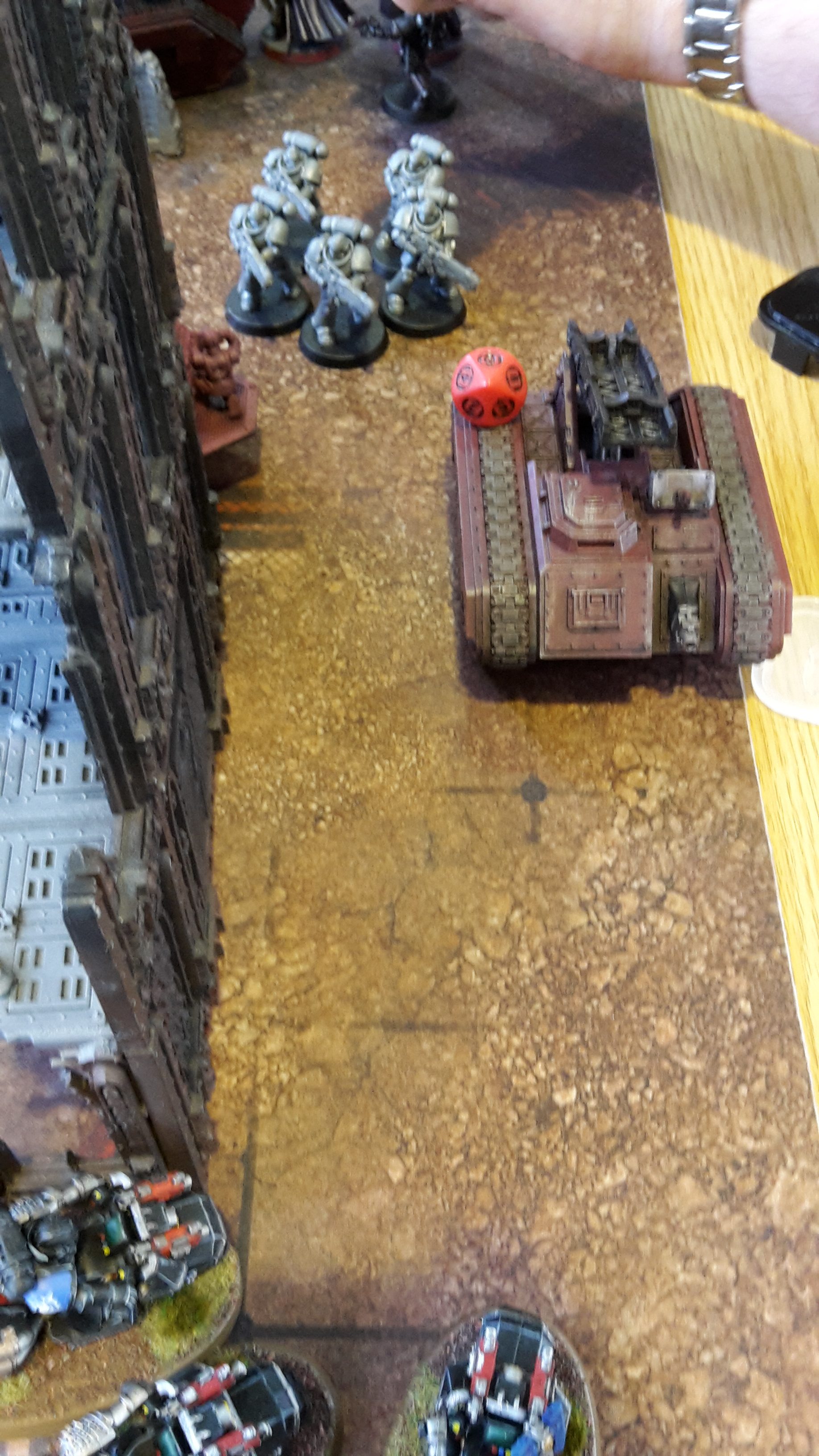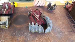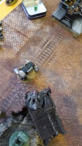 All units in combat fell back to escape the Deathwatch forces. The lone Inceptor Marine moved to the top of the ruins over the Dreadnought, while the two Basilisks, Deathstrike and Wyvern moved away from the enemy forces. The Eversor moved to the ground floor of the ruins, out of sight of the enemy firepower.
