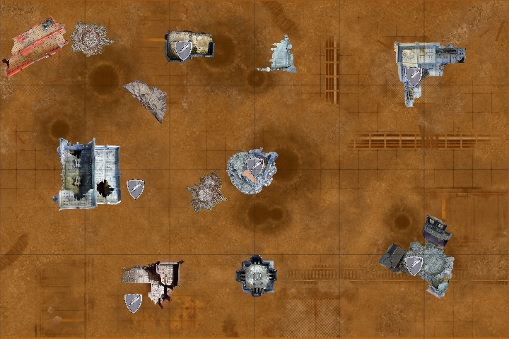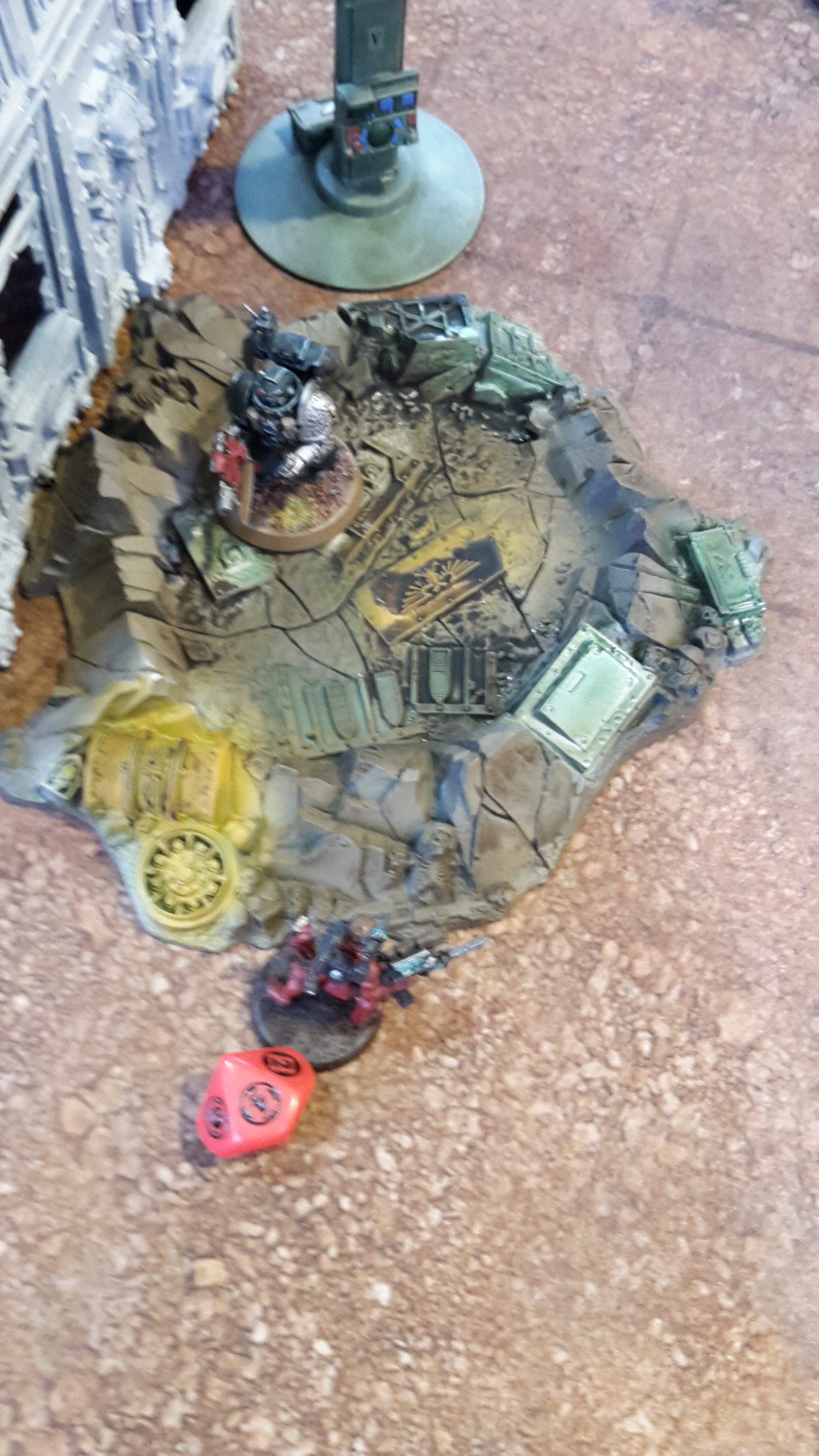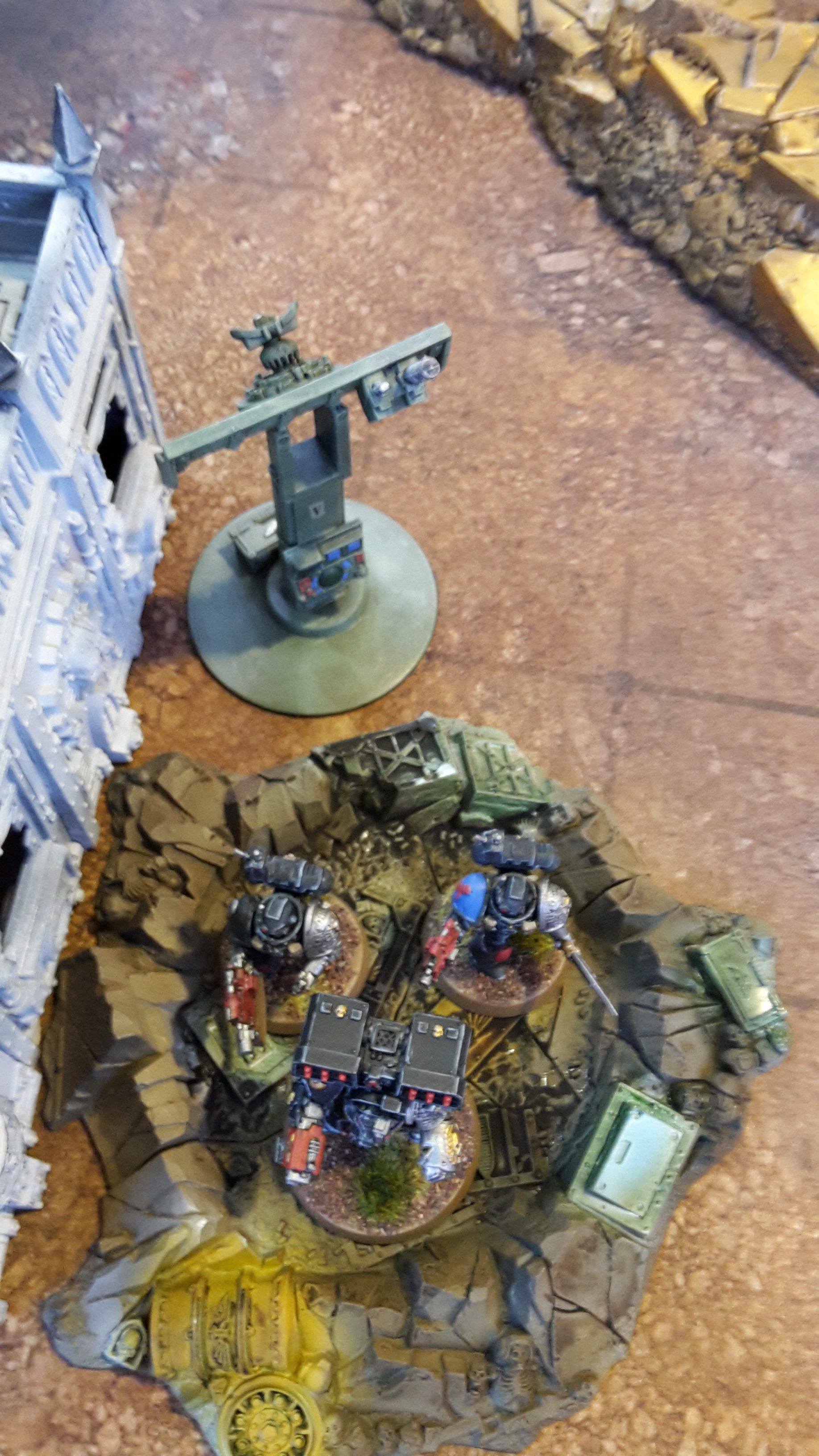 All units in combat fell back to escape the Deathwatch forces. The lone Inceptor Marine moved to the top of the ruins over the Dreadnought, while the two Basilisks, Deathstrike and Wyvern moved away from the enemy forces. The Eversor moved to the ground floor of the ruins, out of sight of the enemy firepower.