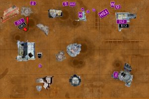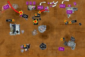 The Basilisks split their fire between the three Deathwatch Bike Squads. Two of the artillery tanks failed to cause any damage (thanks to some poor rolls by Will), but the third managed to kill two of the Bikers in the squad to the right. The three Heavy Bolters from the tanks fired at Kill Team 1, but failed to slay any thanks to the protection of the cover.