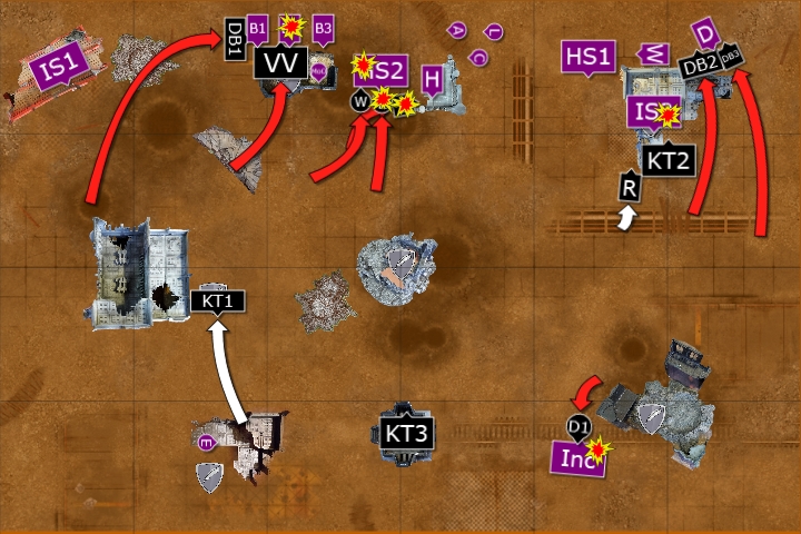 The Hydra opened fire at the Vanguard Veterans, killing one of the squad. The Captain, Ancient and Lieutenant fired at the squad, killing one more with their combined firepower.