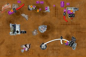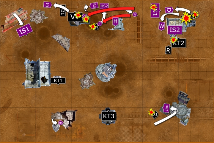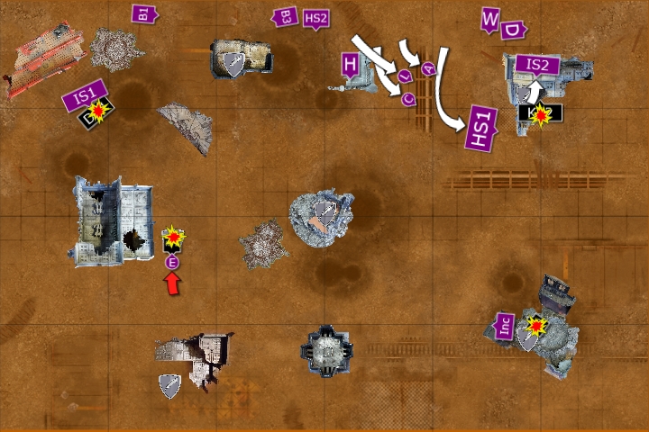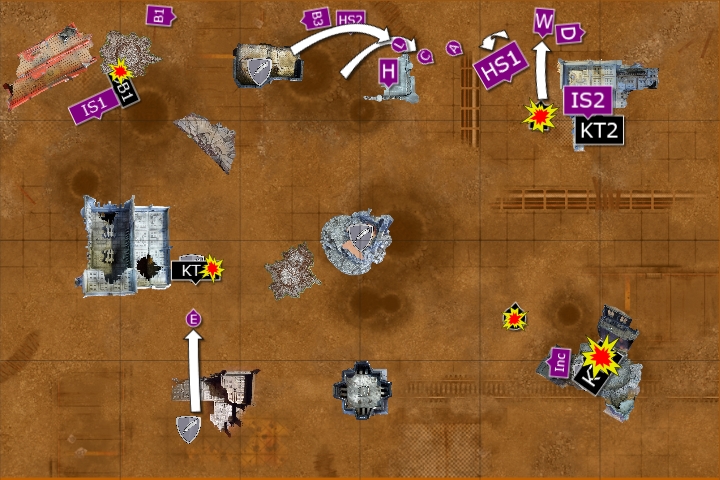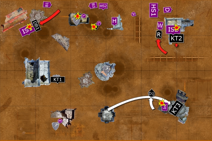 The Wyvern fired at the Kill Team in the ruins, wounding 5 times and killing one of the squad. The Captain fired at the squad, wounding them three times and killing another. One Basilisk fired at the survivor and killed him with his artillery shelling.
