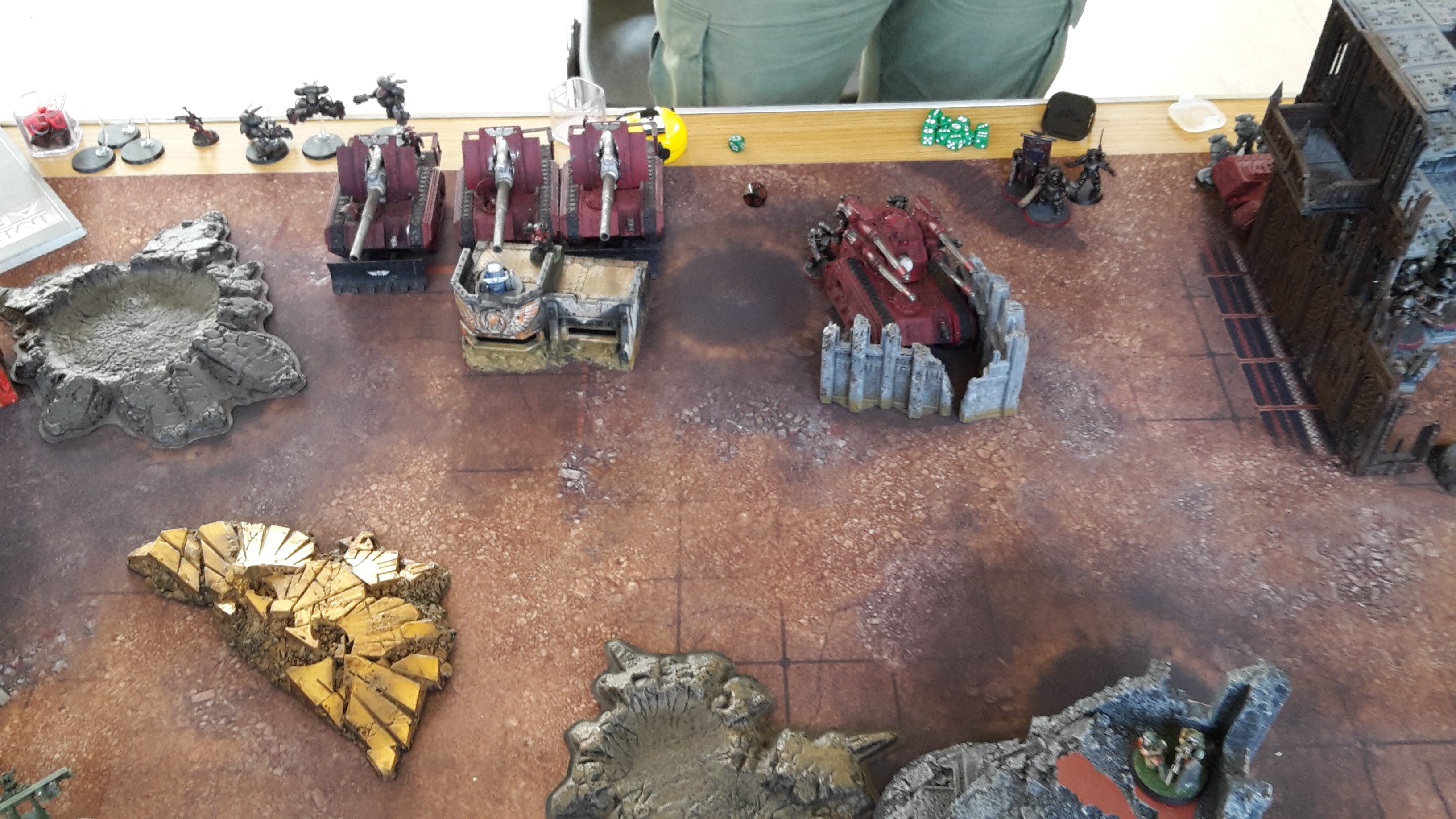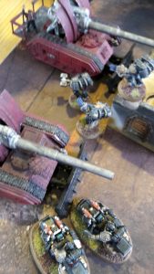 The Basilisks opened fire on their targets. One fired at the Dreadnought, but failed to cause any harm. Another fired at the Kill Team from the Corvus Blackstar, killing one of the squad. The third fired at the same Kill Team, but failed to cause any damage.