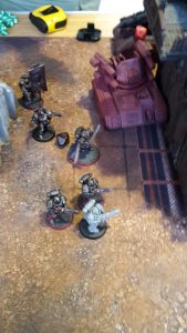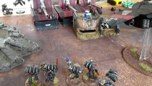 Kill Team one fired on the Basilisk in front of them. The Terminator’s missiles struck one of the vehicles, putting four wounds on it. The Stalker Bolters of the squad had no effect on the vehicle. The Central Kill Team fired at the Hydra, wounding it once with their Bolters.