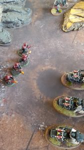 On the right flank, the Bikes assaulted the Deathstrike. The squad were unable to harm the enemy vehicle, suffering one wound as the Deathstrike attacked back.